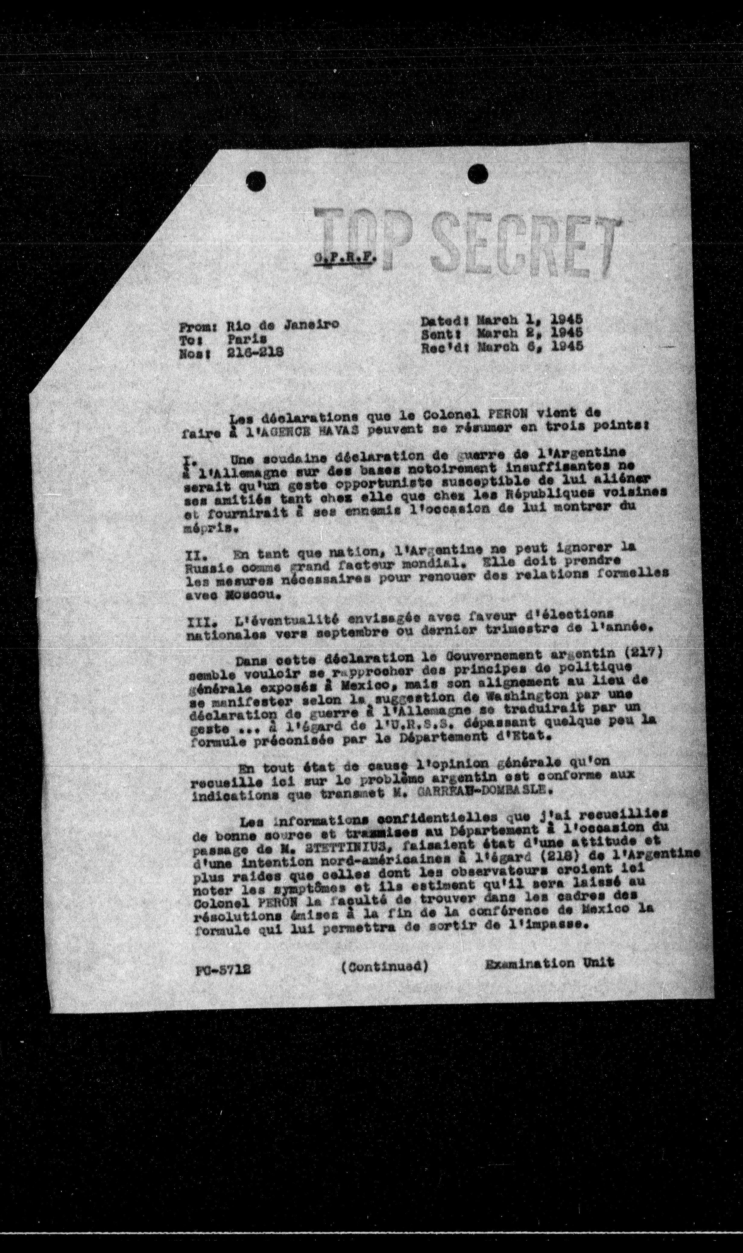 Les informations confidentielles que j'ai recueillies de bonne source et transmises au Département à l'occasion du passage de M. STETTINIUS, faisaient état d'une attitude et d'une intention nord-américaines à l'égard (218) de l'Argentine plus raides que celles dont les observateurs croient ici noter les symptômes et ils estiment qu'il sera laissé au Colonel PERON la faculté de trouver dans les cadres des résolutions de l'oeil à la fin de la conférence de Mexico la formule qui lui permettra de sortir de l'impasse.
