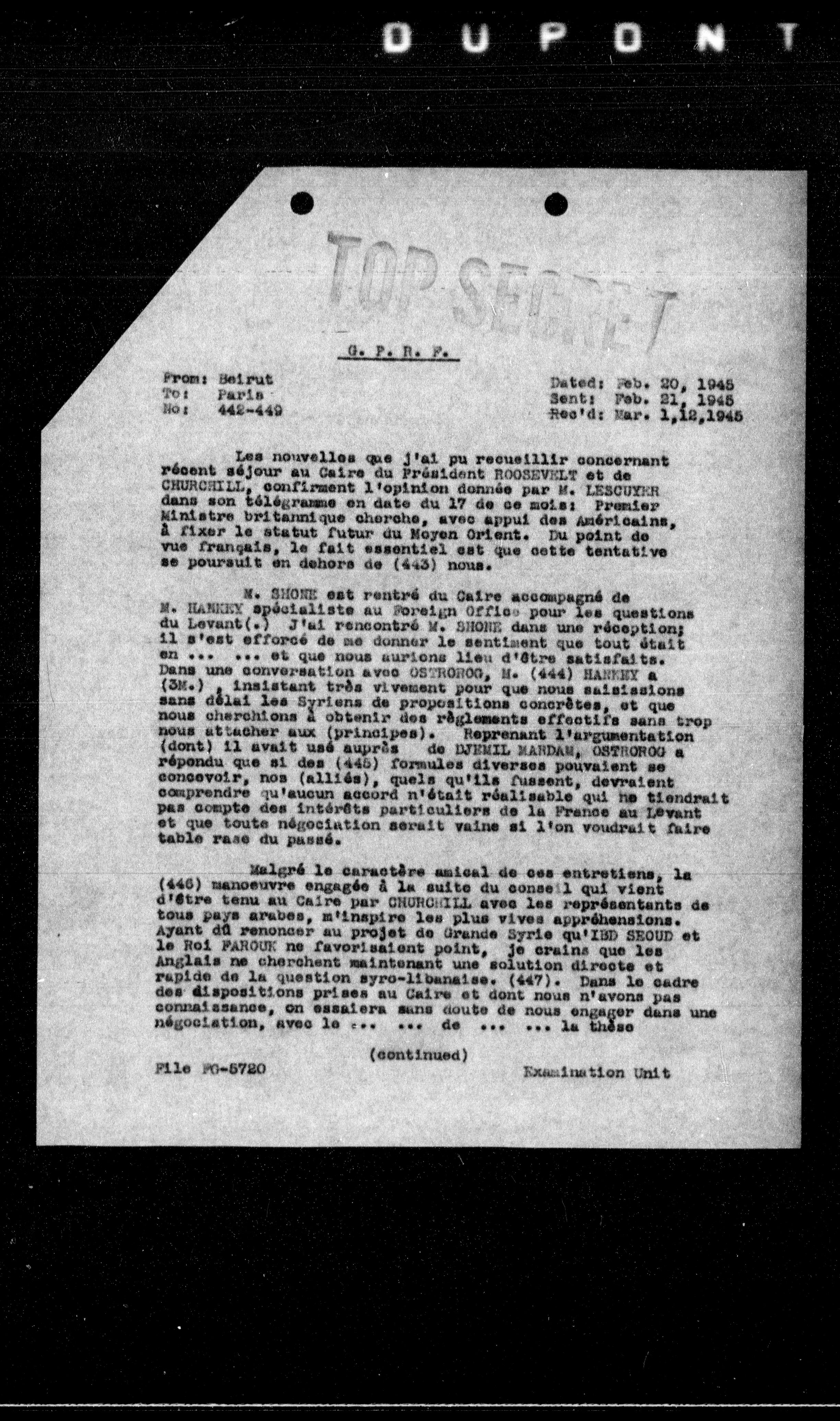 Les nouvelles que j'ai pu recueillir concernant récent séjour au Caire du Président ROOSEVELT et de CHURCHILL, confirment l'opinion donnée par M. LESCUTER dans son télégramme en date du 17 de ce mois: Premier Ministre britannique cherche, avec appui des Américains, à fixer le statut futur du Moyen Orient. Du point de vue français, le fait essentiel est que cette tentative se poursuit en dehors de (443) nous.