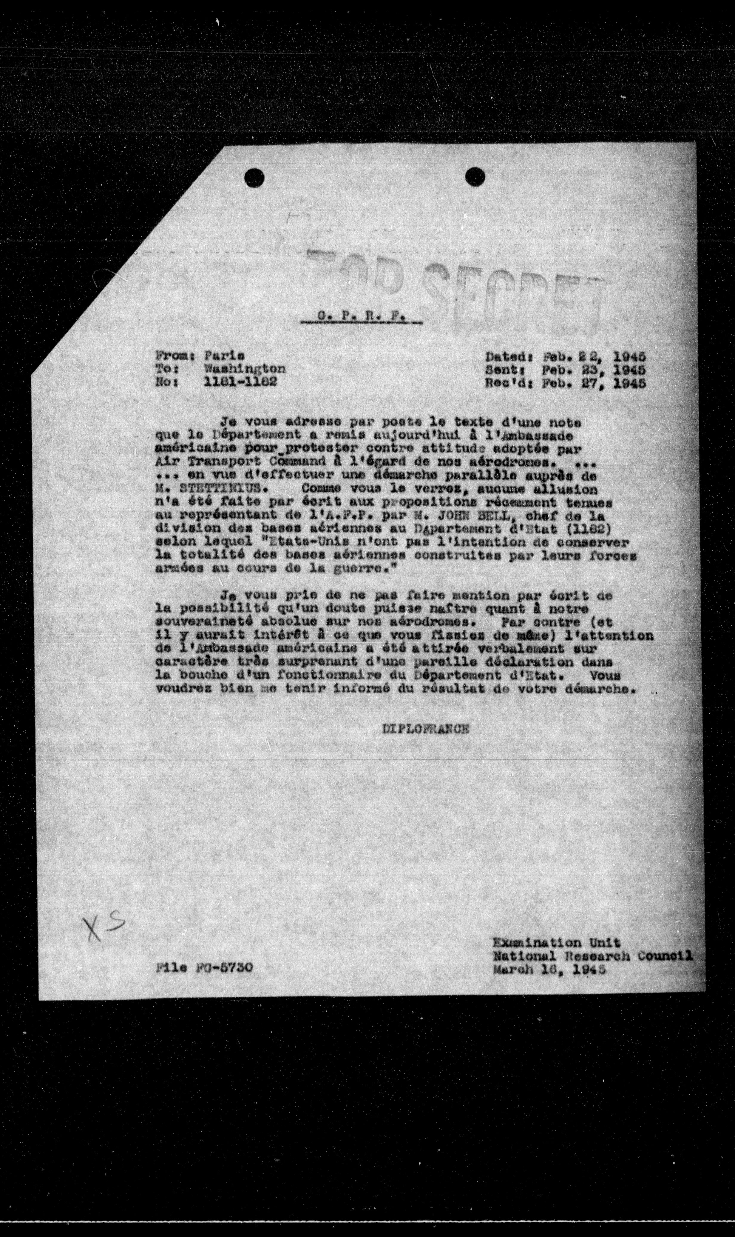 Je vous adresse par poste le texte d'une note que le Département a remis aujourd'hui à l'Ambassade américaine pour protester contre attitude adoptée par Air Transport Command à l'érard de nos aérodromes. ... ... en vue d'effectuer une démarche parallèle auprès de M. STETTINIUS. Comme vous le verrez, aucune allusion n'a été faite par écrit aux propositions récemment tenues au représentant de l'A.F.F. par M. JOHN BELL, chef de la division des bases aériennes au Département d'Etat (1102) selon lequel "Etats-Unis n'ont pas l'intention de conserver la totalité des bases aériennes construites par leurs forces armées au cours de la guerre."