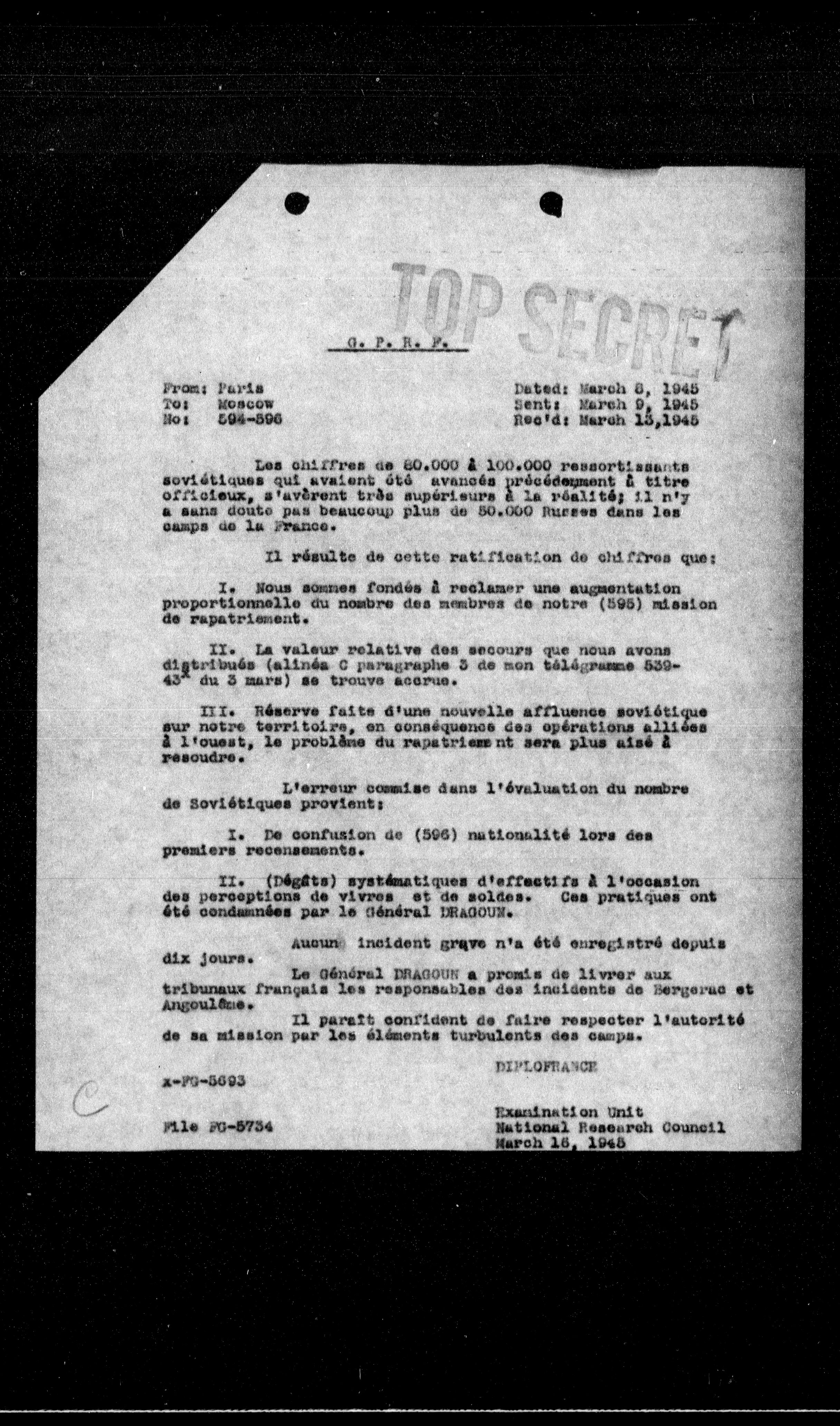 Les chiffres de 80.000 à 100.000 ressortissants soviétiques qui avaient été avancés précédemment à titre officieux, s'avèrent très supérieurs à la réalité; il n'y a sans doute pas beaucoup plus de 80.000 Russes dans les camps de la France.