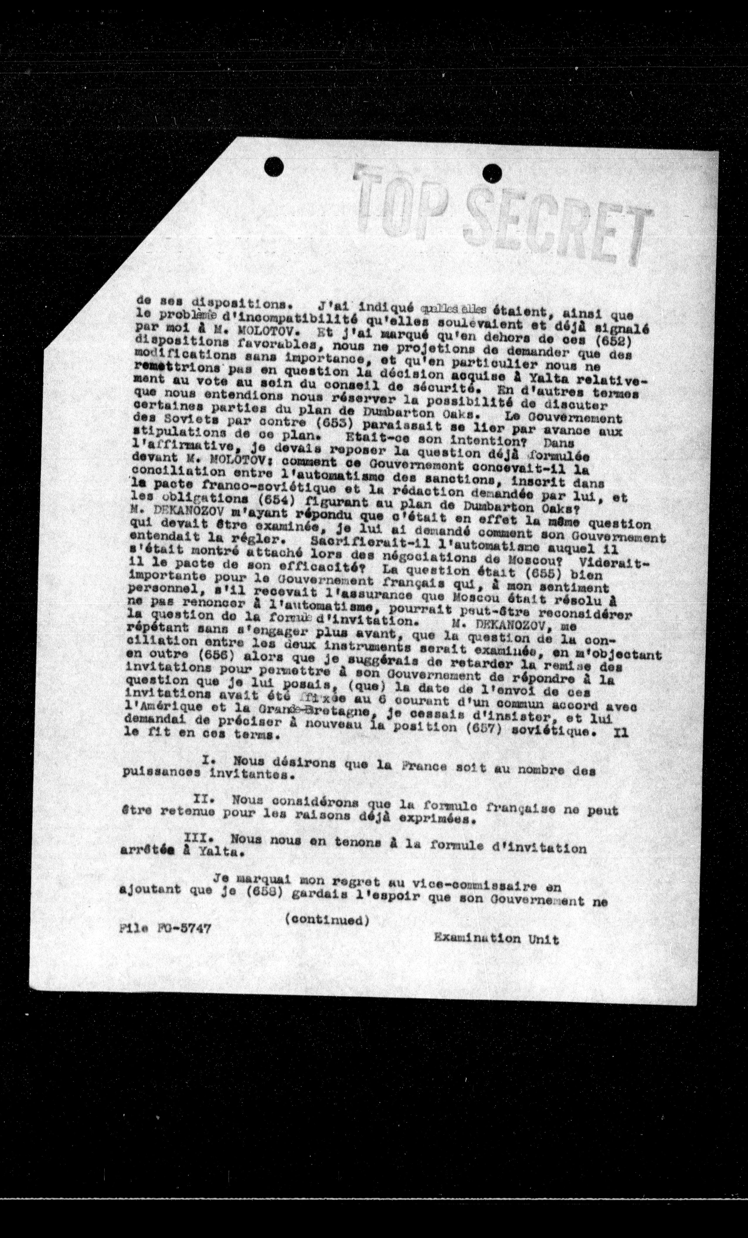 - de ses dispositions. J'ai indiqué qu'il était été, ainsi que le problème d'incompatibilité qu'elles soulevaient et déjà signalé par moi à M. MOLOTOV. Et j'ai marqué qu'en dehors de ces (652) dispositions favorables, nous ne projetons de demander que des modifications sans importance, et qu'en particulier nous ne remettons pas en question la décision acquise à Yalta relativement au vote au sein du conseil de sécurité. En d'autres termes que nous entendions nous réserver la possibilité de discuter certaines parties du plan de Dumbarton Oaks. Le Gouvernement des Soviets par contre (653) paraissait se lier par avance aux stipulations de ce plan. Etait-ce son intention? Dans l'affirmative, je devais reposer la question déjà formulée devant M. MOLOTOV: comment ce Gouvernement concevait-il la conciliation entre l'automatisme des sanctions, inscrit dans la pacte franco-soviétique et la rédaction demandée par lui, et les obligations (654) figurant au plan de Dumbarton Oaks? M. DEKANOZOV m'ayant répondu que c'était en effet la même question qui devait être examinée, je lui ai demandé comment son Gouvernement entendait la régler. Sécrifierait-il l'automatisme auquel il s'était montré attaché lors des négociations de Moscou? Viderait-il le pacte de son efficacité? La question était (655) bien importante pour le Gouvernement français qui, à mon sentiment personnel, s'il recevait l'assurance que Moscou était résolu à ne pas renoncer à l'automatisme, pourrait peut-être reconsiderer la question de la formule d'invitation. M. DEKANOZOV, me répétant sans s'engager plus avant, que la question de la conciliation entre les deux instruments serait examinée, en m'objectant en outre (656) alors que je suggérais de retarder la remise des invitations pour permettre à son Gouvernement de répondre à la question que je lui posais, (que) la date de l'envoi de ces invitations avait été fixée au 6 courant d'un commun accord avec l'Amérique et la Grande-Bretagne, je cessais d'insister, et lui demandai de préciser à nouveau la position (657) soviétique. Il le fit en ces termes.