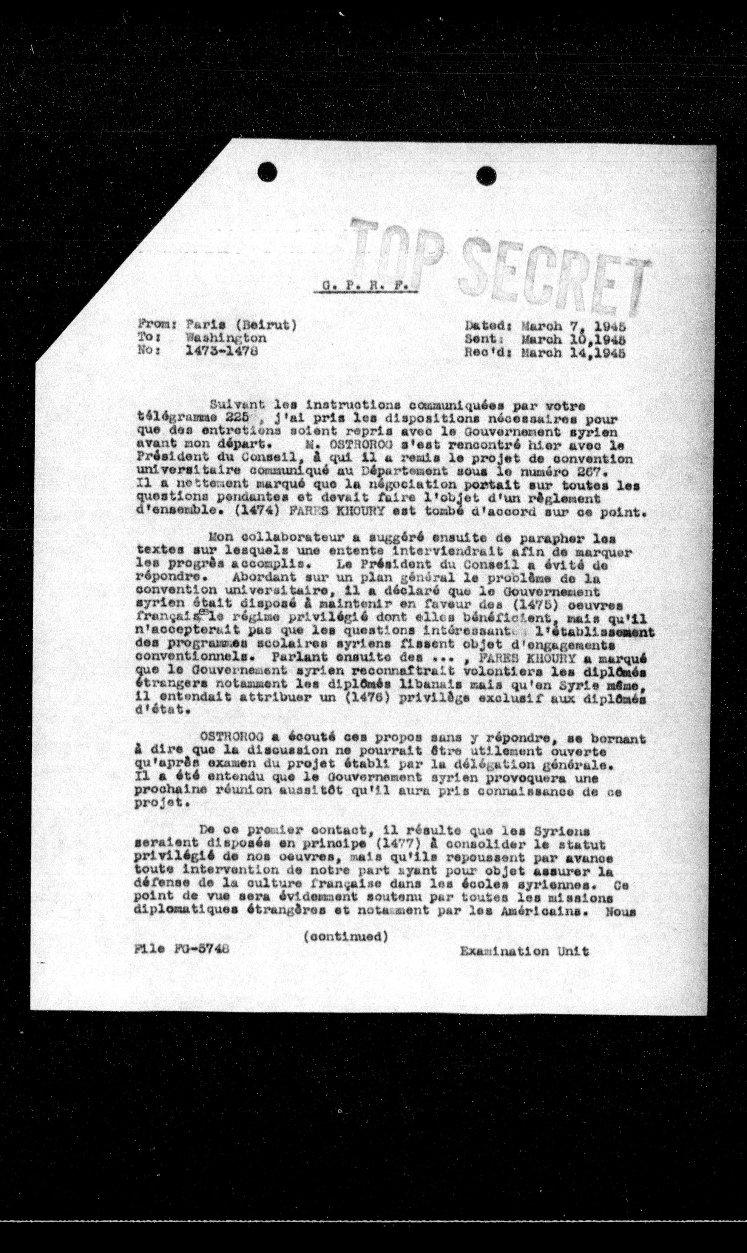 Sulvant les instructions communiquées par votre télégramme 225, j'ai pris les dispositions nécessaires pour que des entretiens soient repris avec le Gouvernement syrien avant mon départ. M. OSTROROG s'est rencontré hier avec le Président du Conseil, à qui il a remis le projet de convention universitaire communiqué au Département sous le numéro 267. Il a nettement marqué que la négociation portait sur toutes les questions pendantes et devait faire l'objet d'un règlement d'ensemble. (1474) FARES KHOURY est tombé d'accord sur ce point.