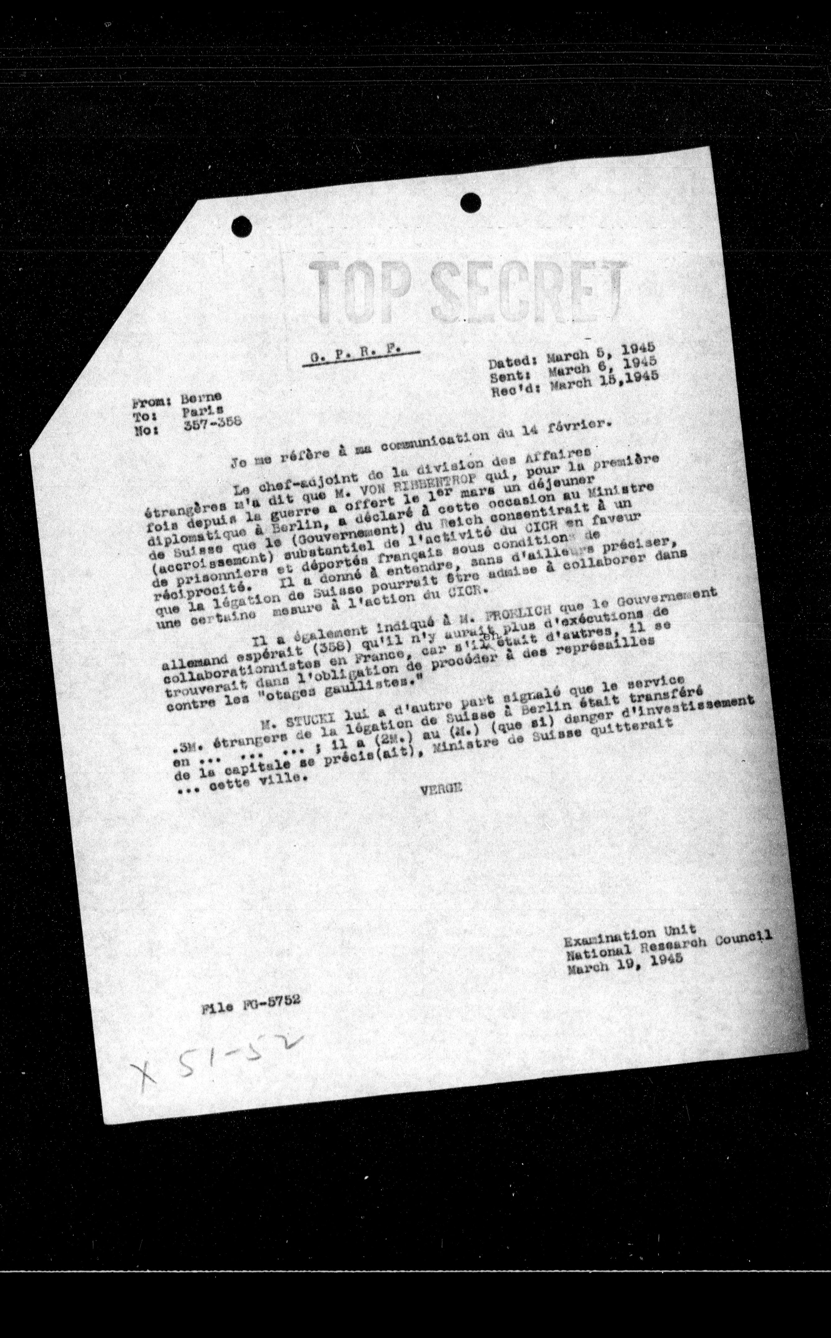 Le chef-maj point de la division des Affaires étrangères m'a dit que M. VON HINSESTHOF, qui, pour la première fois depuis la guerre a offert le 1er mars un déjeuner diplomatique à Berlin, a déclaré à cette occasion au Ministre de la Suisse que le (Gouvernement) du Reich consentirait à un (accroissement) substantiel de l'activité du CICH en faveur de prisonniers et déportés français sous conditions de réciprocité. Il a donné à entendre, sans d'ailleurs préciser, que la légation de Suisse pourrait être admise à collaborer dans une certaine mesure à l'action du CICH.