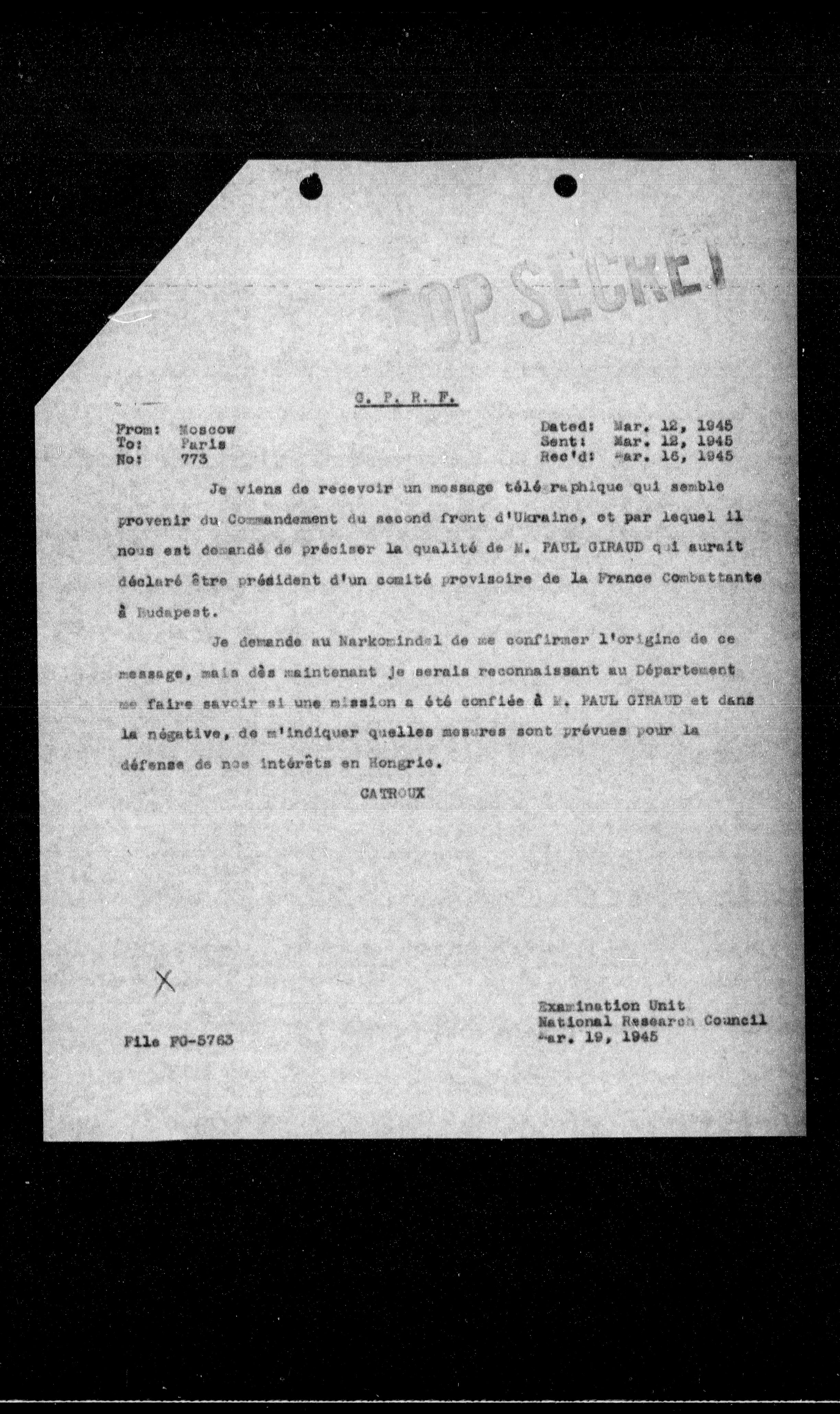 Je viens de recevoir un message télé graphique qui semble provenir du Commandement du second front d'Ukraine, et par lequel il nous est demandé de préciser la qualité de M. PAUL GIRAUD qui aurait déclaré être président d'un comité provisoire de la France Combattante à Budapest.