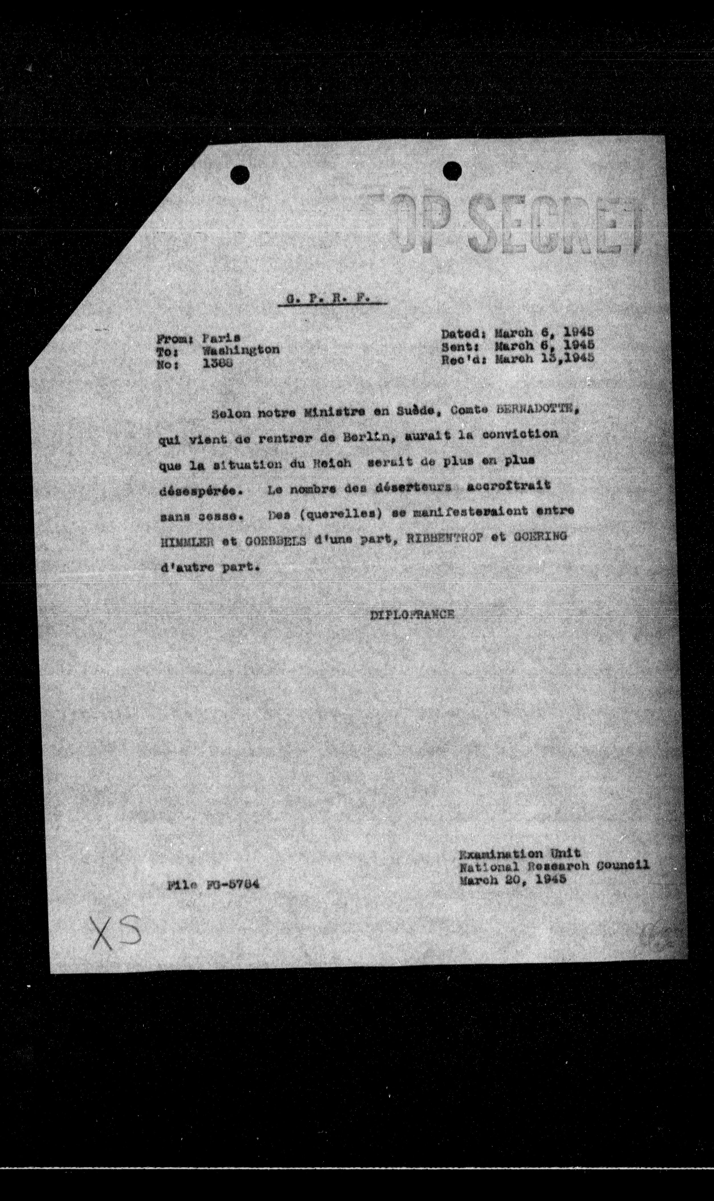 Solon notre Ministre en Suède, Comte BERNADOTTE, qui vient de rentrer de Berlin, aurait la conviction que la situation du Melah serait de plus en plus désespérée. Le nombre des déserteurs accroitrait sans cesse. Des (querelles) se manifesteraient entre HIMMER et GOEBREIS d'une part, BIBMENTROF et GOERING d'autre part.