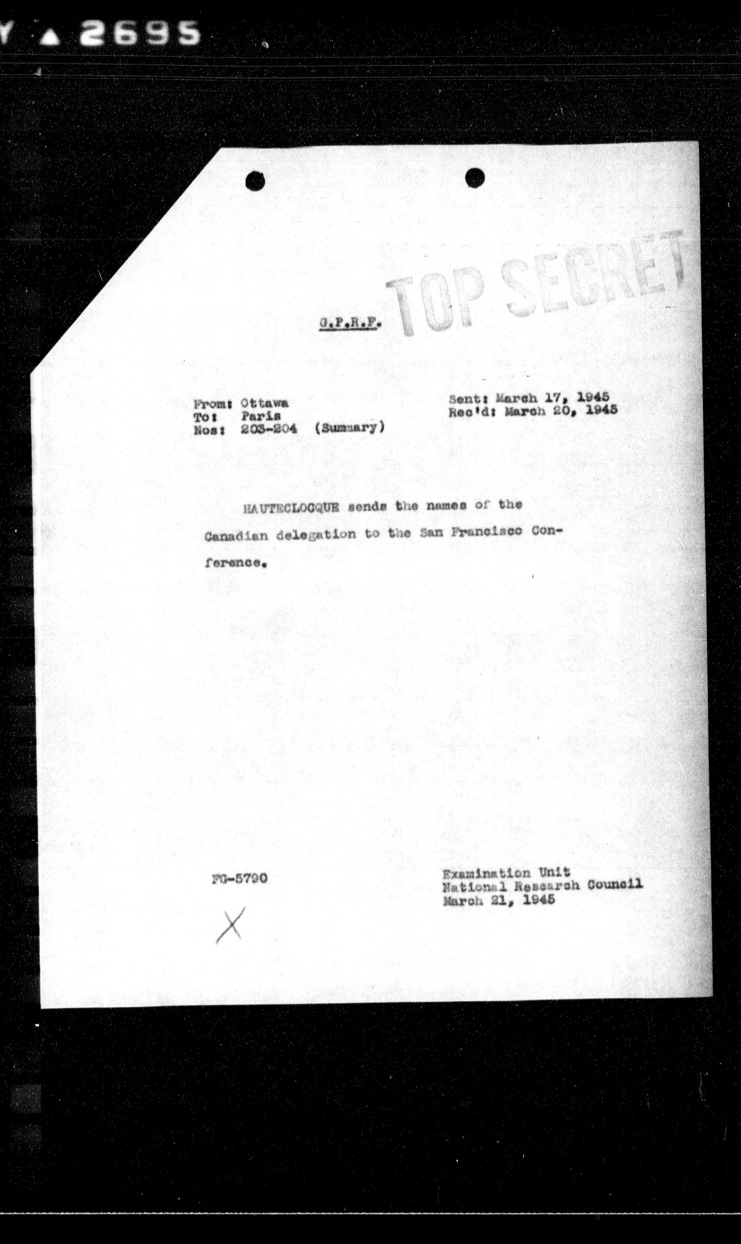 **HAUTECOQUE** sends the names of the Canadian delegation to the San Francisco Conference.