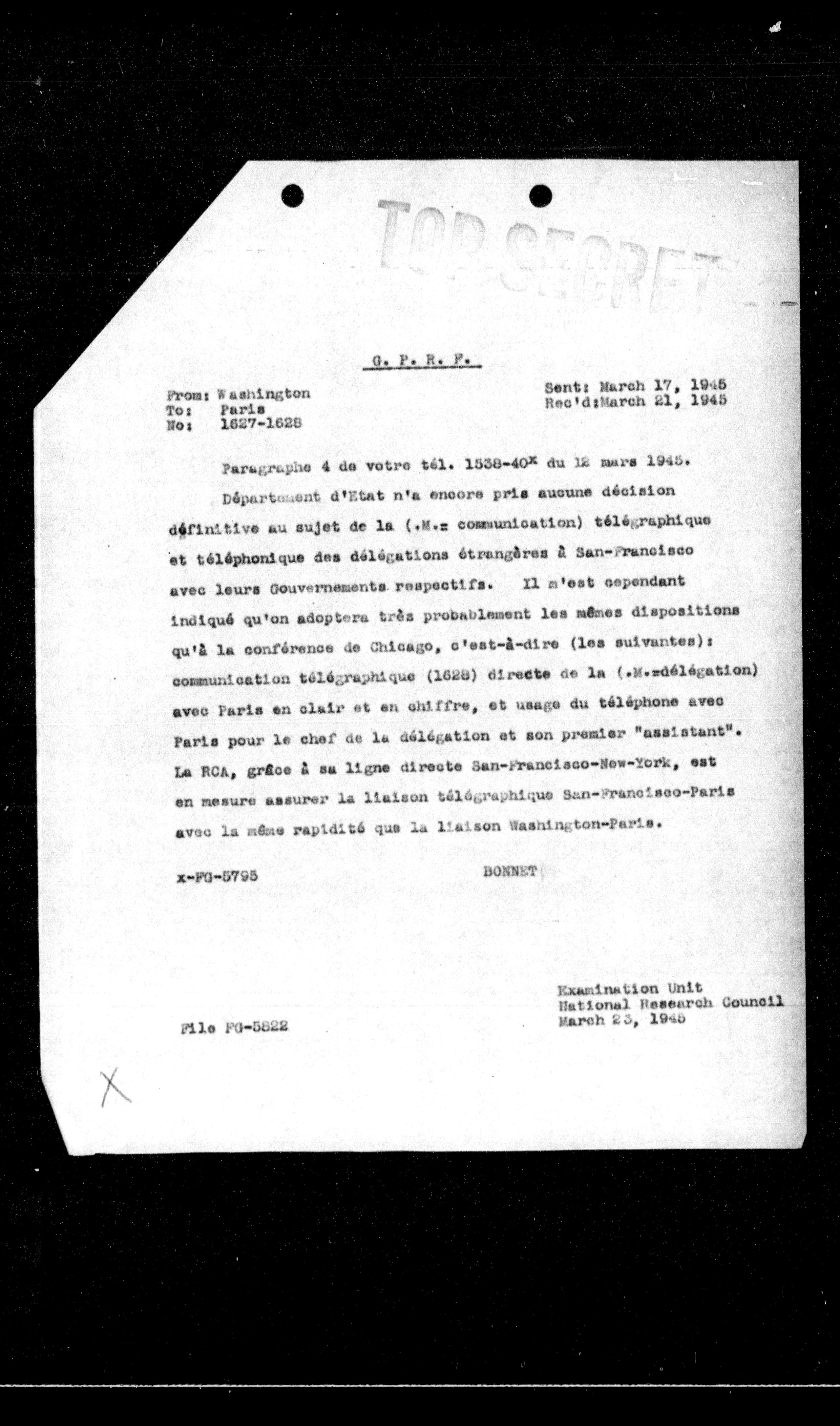 Département d'Etat n'a encore pris aucune décision définitive au sujet de la ( $N . z$ communication) télégraphique et téléphonique des délégations étrangères à San-Francisco avec leurs Gouvernements respectifs. Il n'est cependant indiqué qu'on adoptera très probablement les mêmes dispositions qu'à la conférence de Chicago, c'est-à-dire (les suivantes): communication télégraphique (1828) directe de la ( $N . z$ délégation) avec Paris en clair et en chiffre, et usage du téléphone avec Paris pour le chef de la délégation et son premier "assistant". La RCA, grâce à sa ligne directe San-Francisco-New-York, est en mesure assurer la liaison télégraphique San-Francisco-Paris avec la même rapidité que la liaison Washington-Paris.