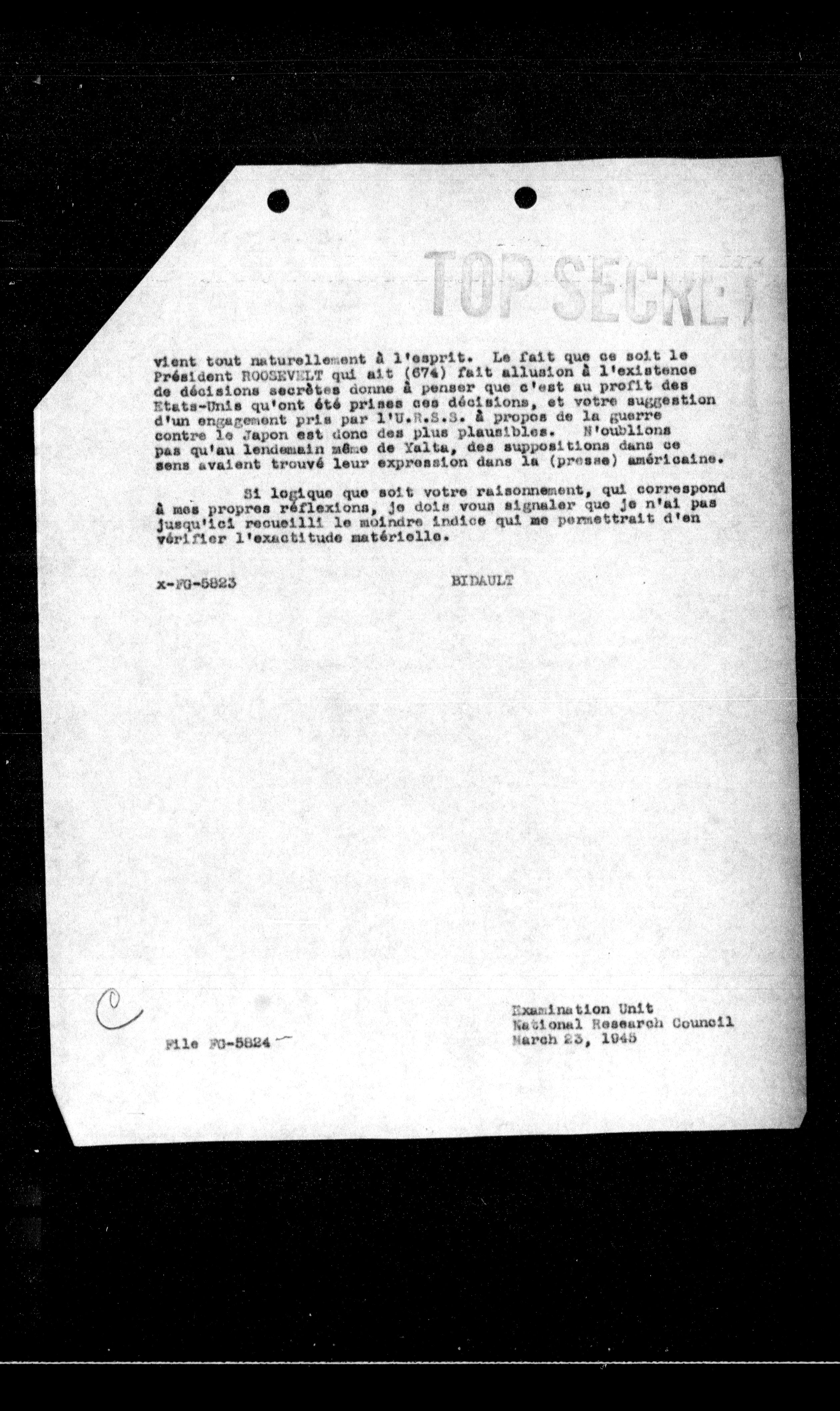 vient tout naturellement a l'esprit. Le fait que ce soit le Président ROOSEVELT qui ait (674) fait allusion a l'existence de décisions secrètes donne a penser que c'est au profit des Etats-Unis qu'ont été prises ces décisions, et votre suggestion d'un engagement pris par l'G.R.S.S. a propos de la guerre contre le Japon est donc des plus plausibles. N'oublions pas qu'au lendemain même de Yalta, des suppositions dans ce sens avaient trouvé leur expression dans la (presse) américaine.