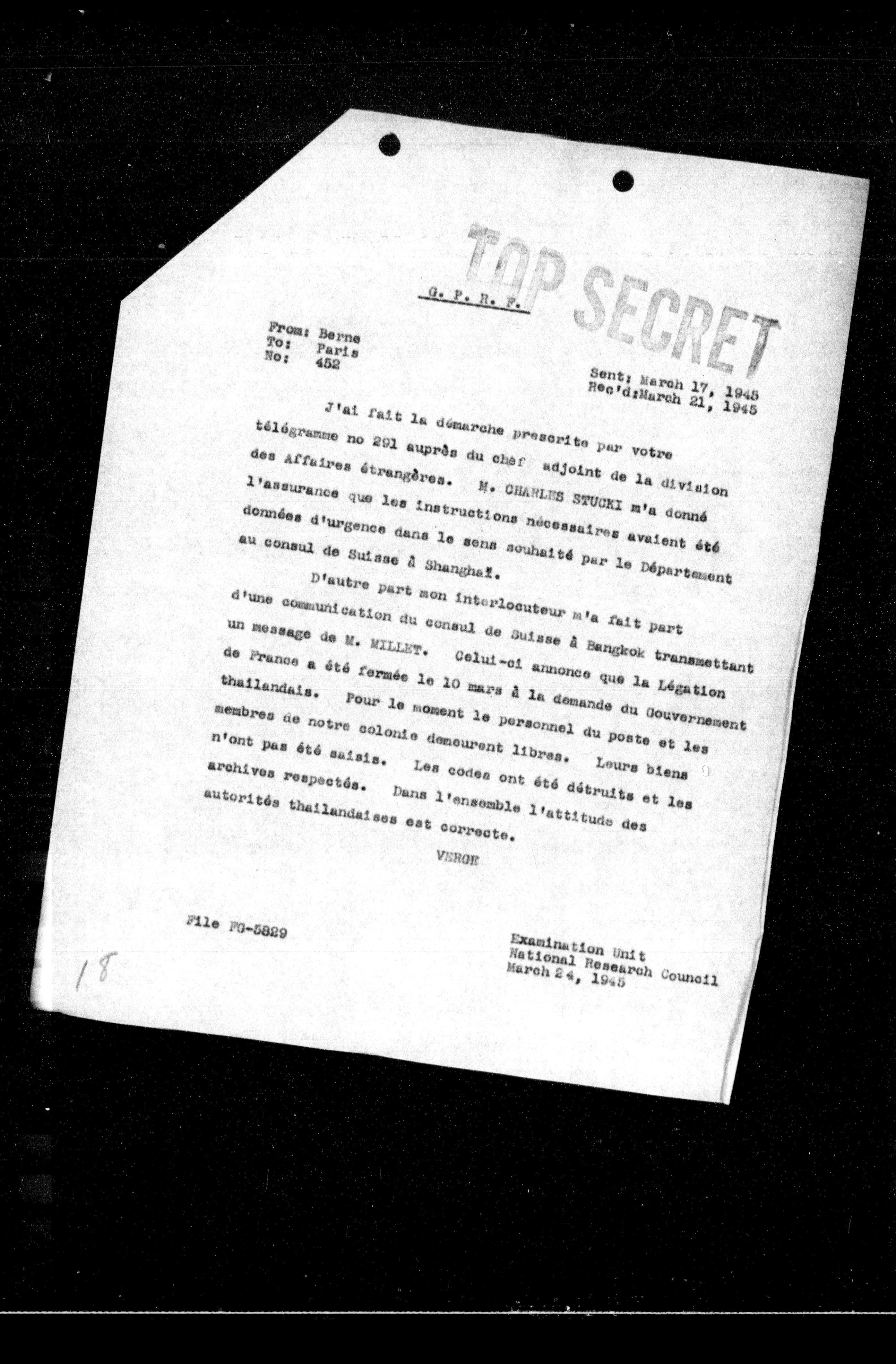D'autre part mon interlocuteur m'a fait part d'une communication du consul de Suisse à Bangkok transmettant un message de M. MILLET. Celui-ci annonce que la Légation de France a été fermée le 10 mars à la demande du Gouvernement thailandais. Pour le moment le personnel du poste et les membres de notre colonie demeurent libres. Leurs biens n'ont pas été saisis. Les codes ont été détruits et les archives respectés. Dans l'ensemble l'attitude des autorités thailandaises est correcte.