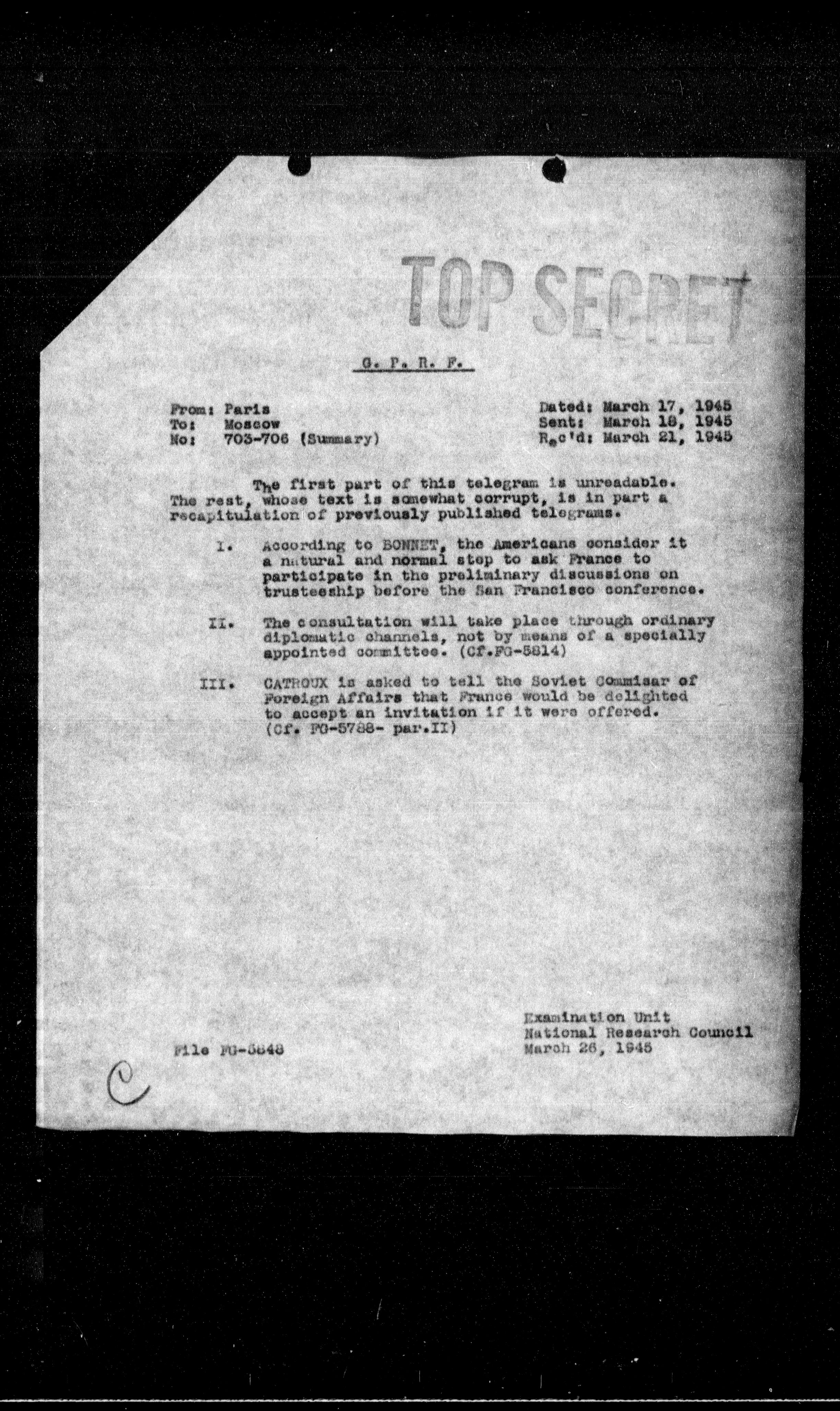 3. CATHOLIX is asked to tell the Soviet Commission of Foreign Affairs that France would be delighted to accept an invitation if it were offered. (Cf. FG-5788- par.II)