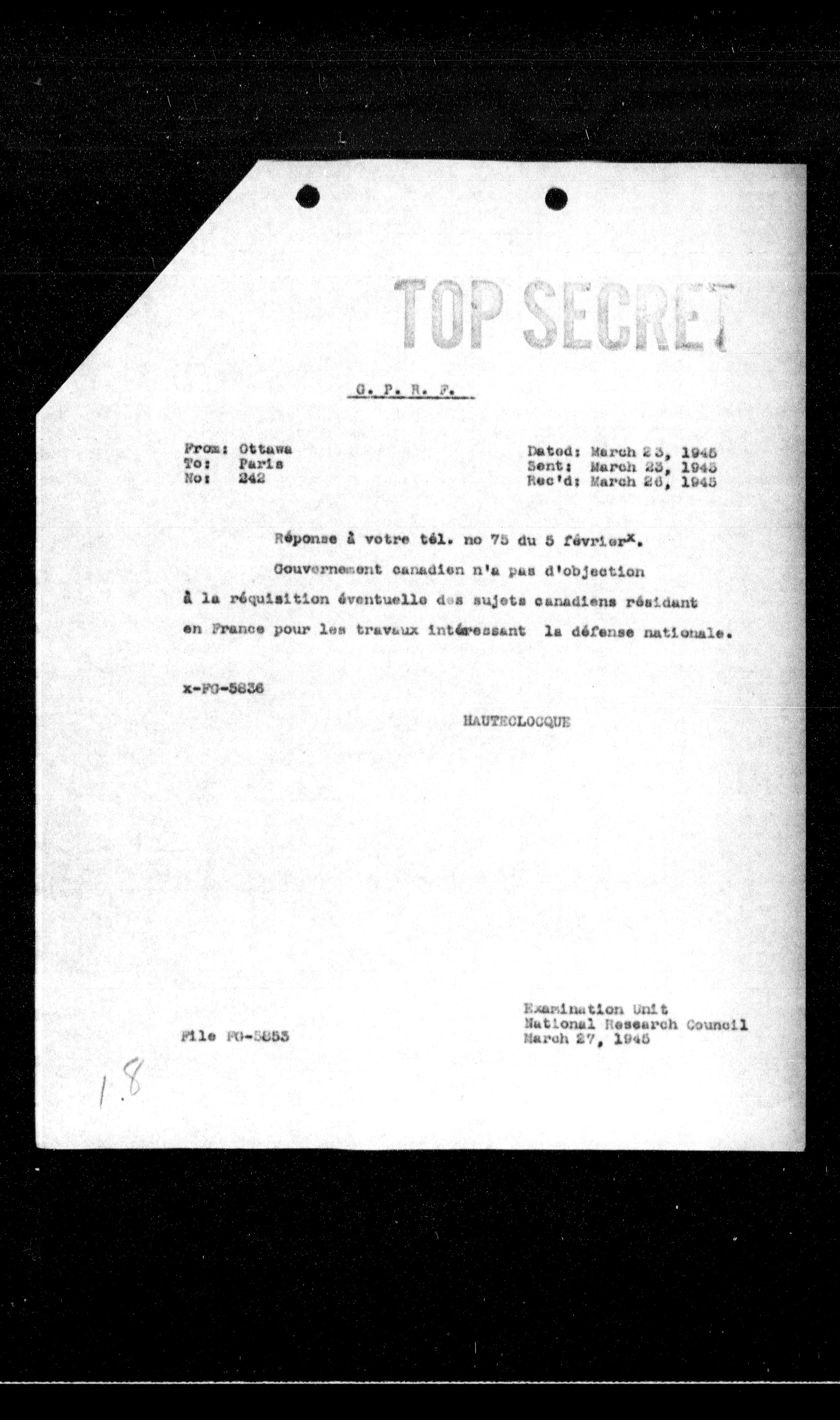 Gouvernement canadien n'a pas d'objection à la réquisition éventuelle des sujets canadiens résidant en France pour les travaux intéressant la défense nationale.