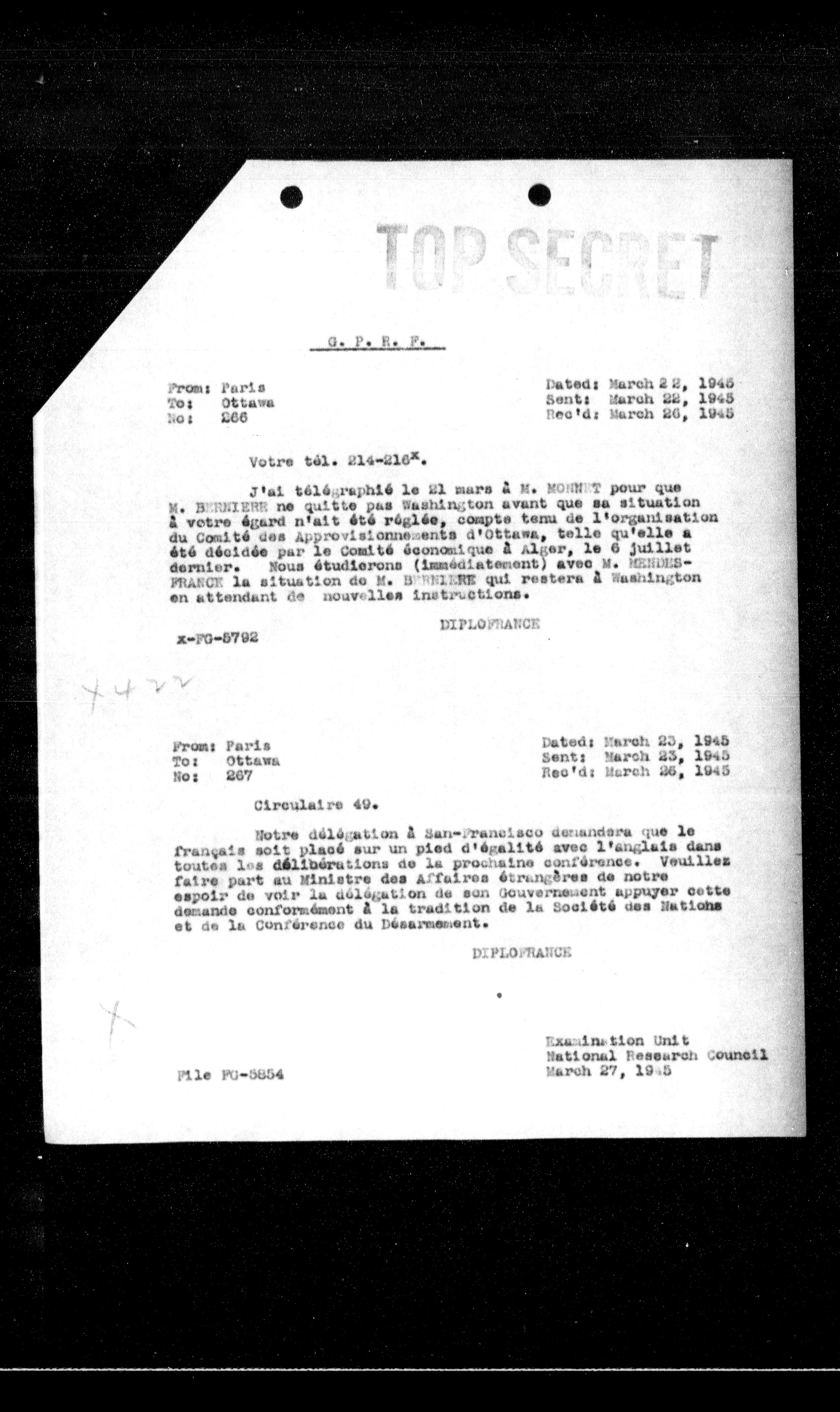 **From:** Paris **To:** Ottawa **No:** 267