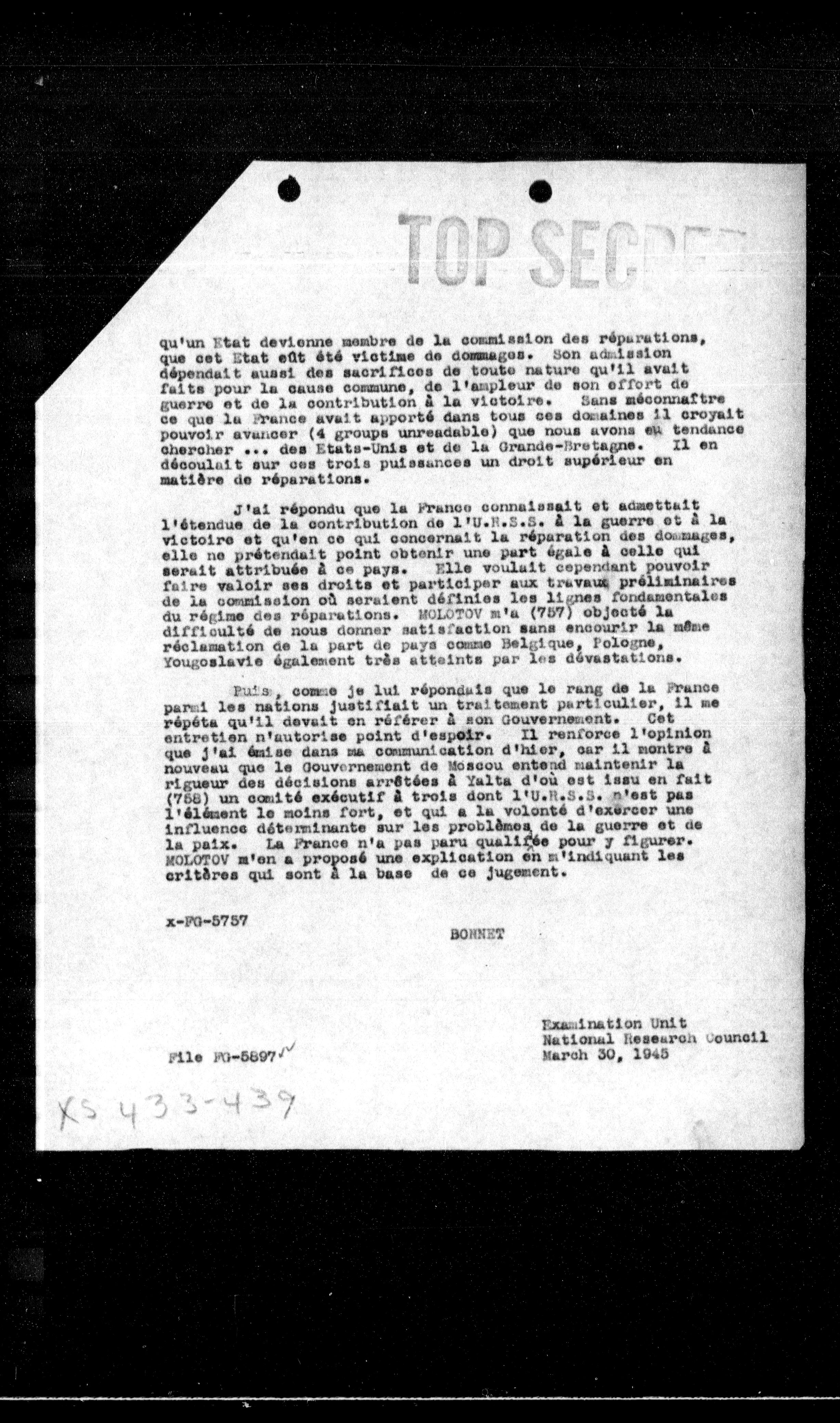 Puis, comme je lui répondais que le rang de la France parmi les nations justifiait un traitement particulier, il me répéta qu'il devait en référer à son Gouvernement. Cet entretien n'autorise point d'espérer. Il renforce l'opinion que j'ai émise dans ma communication d'ULER, car il montre à nouveau que le Gouvernement de Moscou entend maintenir la rigueur des décisions arrêtées à Yalta d'où est issu en fait (758) un comité exécutif à trois dont l'U.R.S.S. m'est pas l'élément le moins fort, et qui a la volonté d'exercer une influence déterminante sur les problèmes de la guerre et de la paix. La France m'a pas paru qualifiée pour y figurer. MOLOTOV m'en a proposé une explication en m'indiquant les critères qui sont à la base de ce jugement.