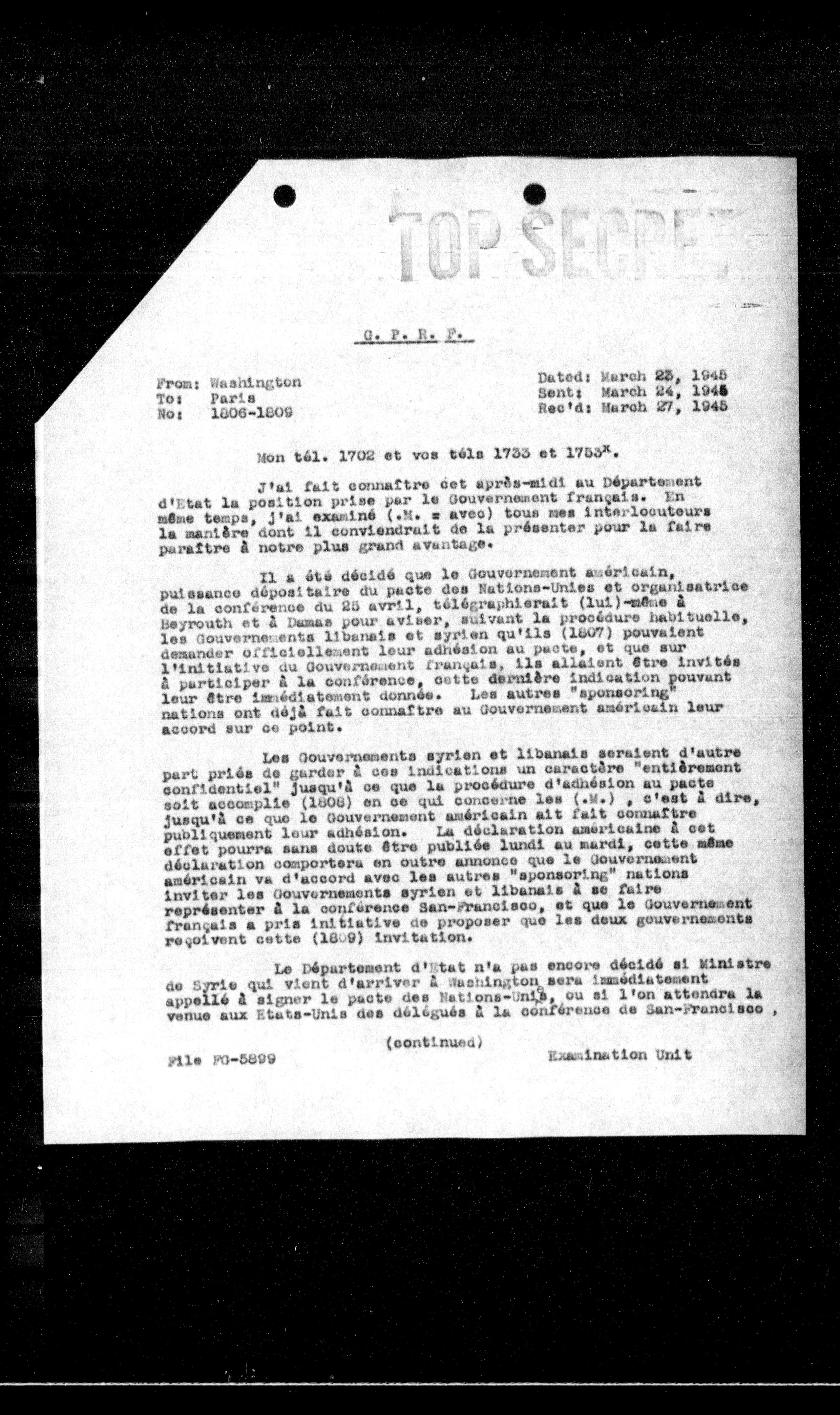 Les Gouvernements syrien et libanais seraient d'autre part priés de garder à ces indications un caractère "entièrement confidentiel" jusqu'à ce que la procédure d'adhésion au pacte soit accomplie (1808) en ce qui concerne les (.M.), c'est à dire, jusqu'à ce que le Gouvernement américain ait fait connaître publiquement leur adhésion. La déclaration américaine à cet effet pourra sans doute être publiée lundi au mardi, cette même déclaration comportera en outre annonce que le Gouvernement américain va d'accord avec les autres "sponsoring" nations inviter les Gouvernements syrien et libanais à se faire représenter à la conférence San-Francisco, et que le Gouvernement français a pris initiative de proposer que les deux gouvernements reçoivent cette (1809) invitation.