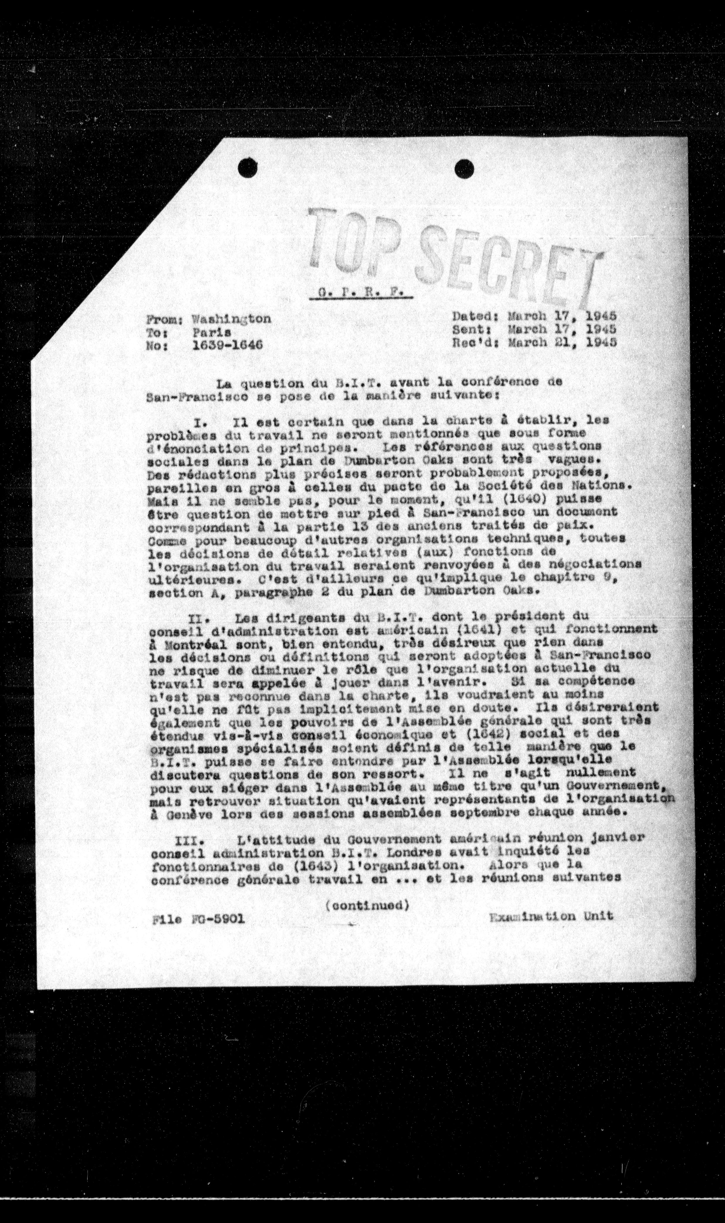 I. Il est certain que dans la charte à établir, les problèmes du travail ne seront mentionnés que sous forme d'énonciation de principes. Les références aux questions sociales dans le plan de Dumbarton Oaks sont très vagues. Des réductions plus précises seront probablement proposées, pareilles en gros à celles du pacte de la Société des Nations. Mais il ne semble pas, pour le moment, qu'il (1640) puisse être question de mettre sur pied à San-Francisco un document correspondant à la partie 13 des anciens traités de paix. Comme pour beaucoup d'autres organisations techniques, toutes les décisions de détail relatives (aux) fonctions de l'organisation du travail seraient renvoyées à des négociations ultérieures. C'est d'ailleurs ce qu'implique le chapitre 9, section A, paragraphe 2 du plan de Dumbarton Oaks.