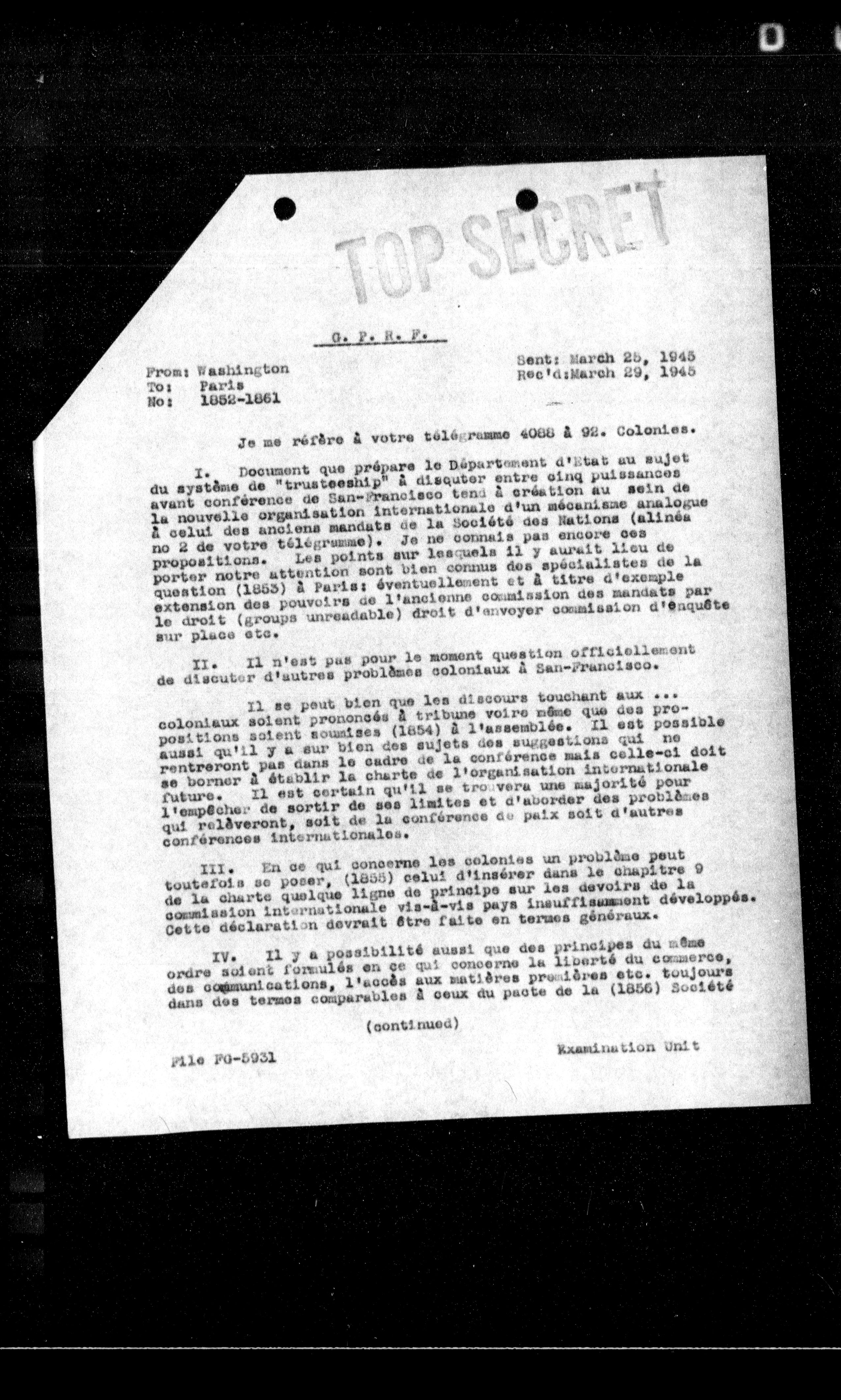 I. Document que prépare le département d'État au sujet du système de "trusteeship" à discuter entre cinq puissances avant conférence de San-Francisco tend à création au sein de la nouvelle organisation internationale d'un mécanisme analogue à celui des anciens mandats de la Société des Nations (alinés no 2 de votre télégramme). Je ne connais pas encore ces propositions. Les points sur lesquels il y aurait lieu de porter notre attention sont bien connus des spécialistes de la question (1853) à Paris; éventuellement et à titre d'exemple extension des pouvoirs de l'ancienne commission des mandats par le droit (groups unreadable) droit d'envoyer commission d'enquête sur place etc.