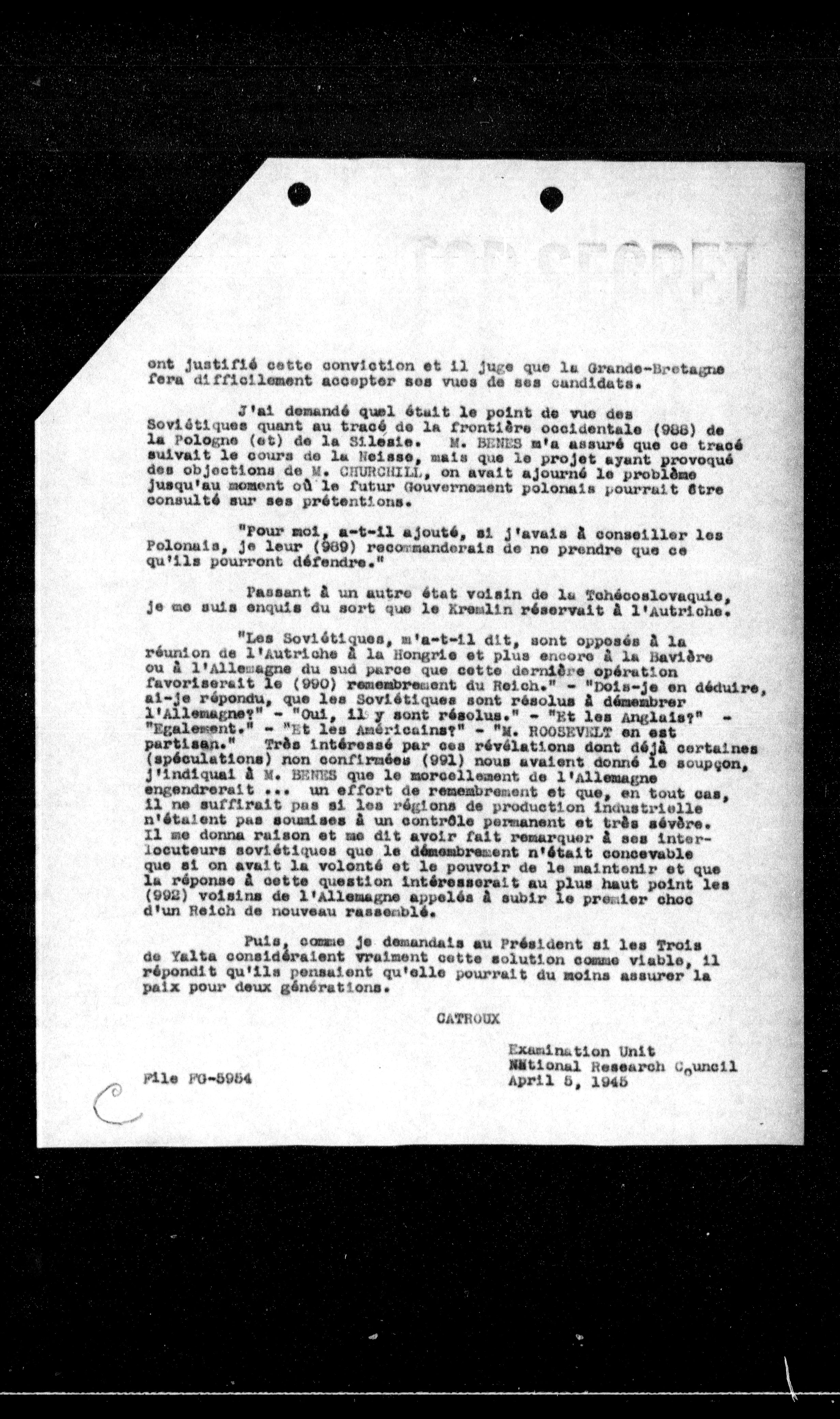 "Les Soviétiques, m'a-t-il dit, sont opposés à la réunion de l'Autriche à la Hongrie et plus encore à la Bavière ou à l'Allemagne du sud parce que cette dernière opération favoriserait le (990) remembrement du Reich." - "Puis-je en déduire, ai-je répondu, que les Soviétiques sont résolus à démembrer l'Allemagne?" - "Oui, il y sont résolus." - "Et les Anglais?" - "Également." - "Et les Américains?" - "M. ROUSSEVELT en est partisan." Très intéressé par ces révélations dont déjà certaines (spéculations) non confirmées (991) nous avaient donné le soupçon, j'indiquai à M. BENES que le morcellement de l'Allemagne engendrerait ... un effort de remembrement et que, en tout cas, il ne suffirait pas si les régions de production industrielle n'étaient pas soumises à un contrôle permanent et très sévère. Il me donna raison et me dit avoir fait remarquer à ses interlocuteurs soviétiques que le démembrement n'était concevable que si on avait la volonté et le pouvoir de le maintenir et que la réponse à cette question intéresserait au plus haut point les (992) voisins de l'Allemagne appelés à subir le premier choc d'un Reich de nouveau rassemblé.