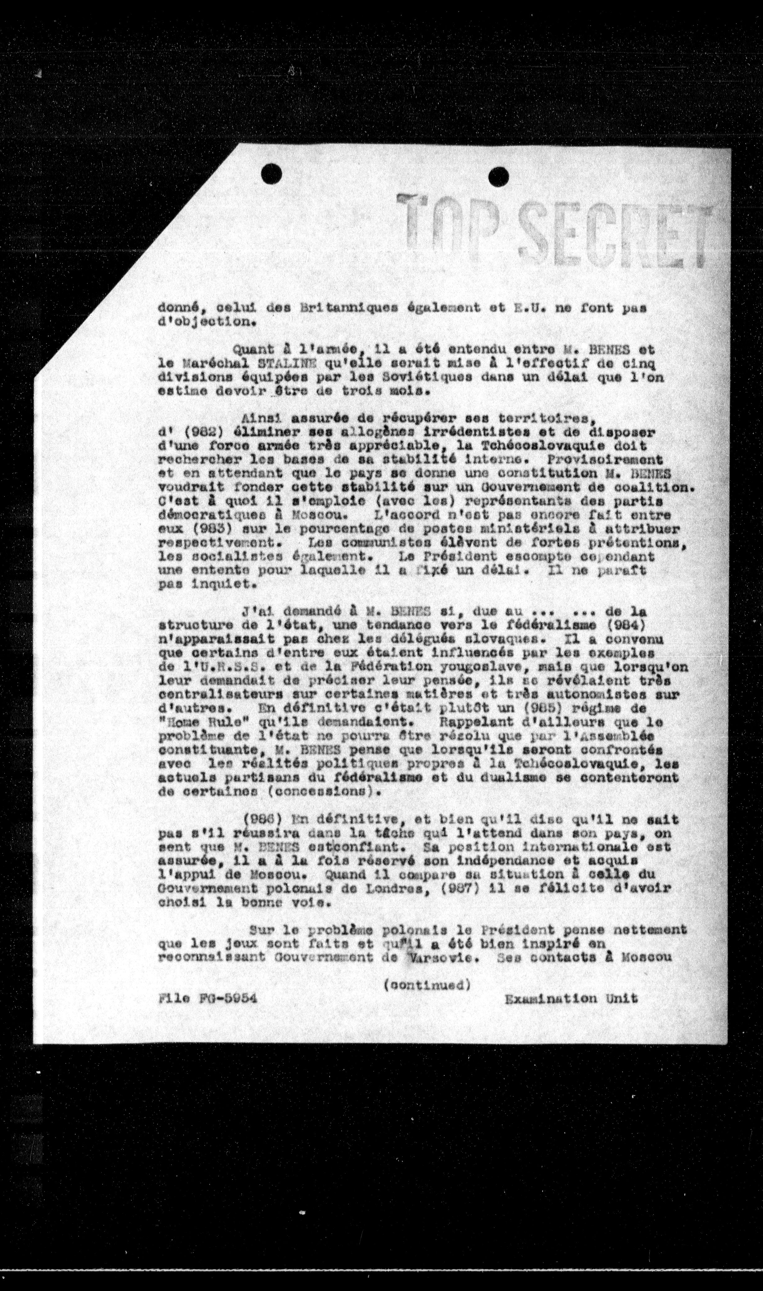 Quant à l'armée, il a été entendu entre M. BENES et le Maréchal STALINE qu'elle serait mise à l'effectif de cinq divisions équipées par les Soviétiques dans un délai que l'on estime devoir être de trois mois.