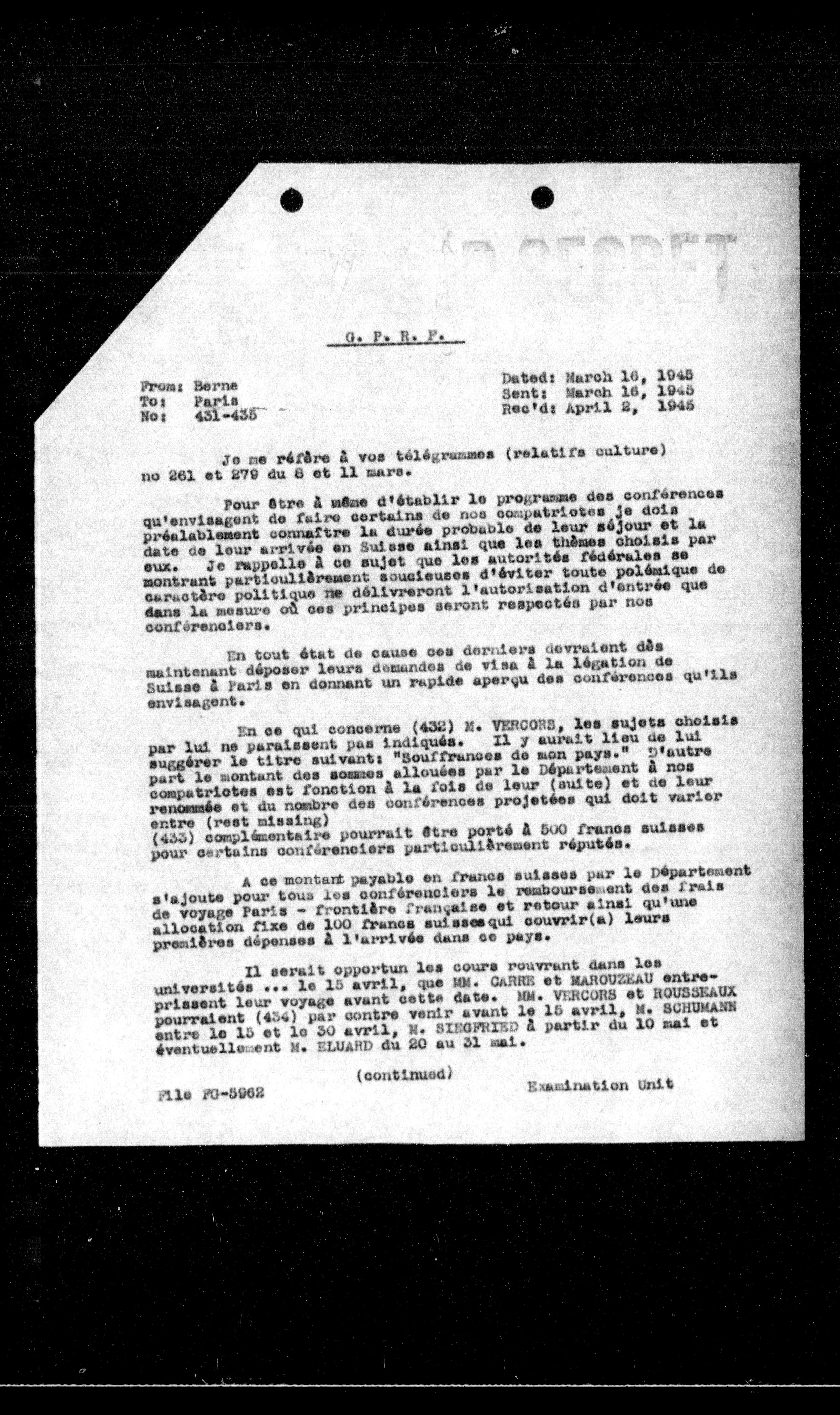 En ce qui concerne (432) M. VERGORE, les sujets choisis par lui ne paraissent pas indiqués. Il y aurait lieu de lui suggérer le titre suivant: "Souffrances de mon pays." D'autre part le montant des sommes allouées par le Département à nos compatriotes est fonction à la fois de leur (suite) et de leur renommée et du nombre des conférences projetées qui doit varier entre (rest missing) (433) complémentaire pourrait être porté à 500 francs suisses pour certains conférenciers particulièrement réputés.