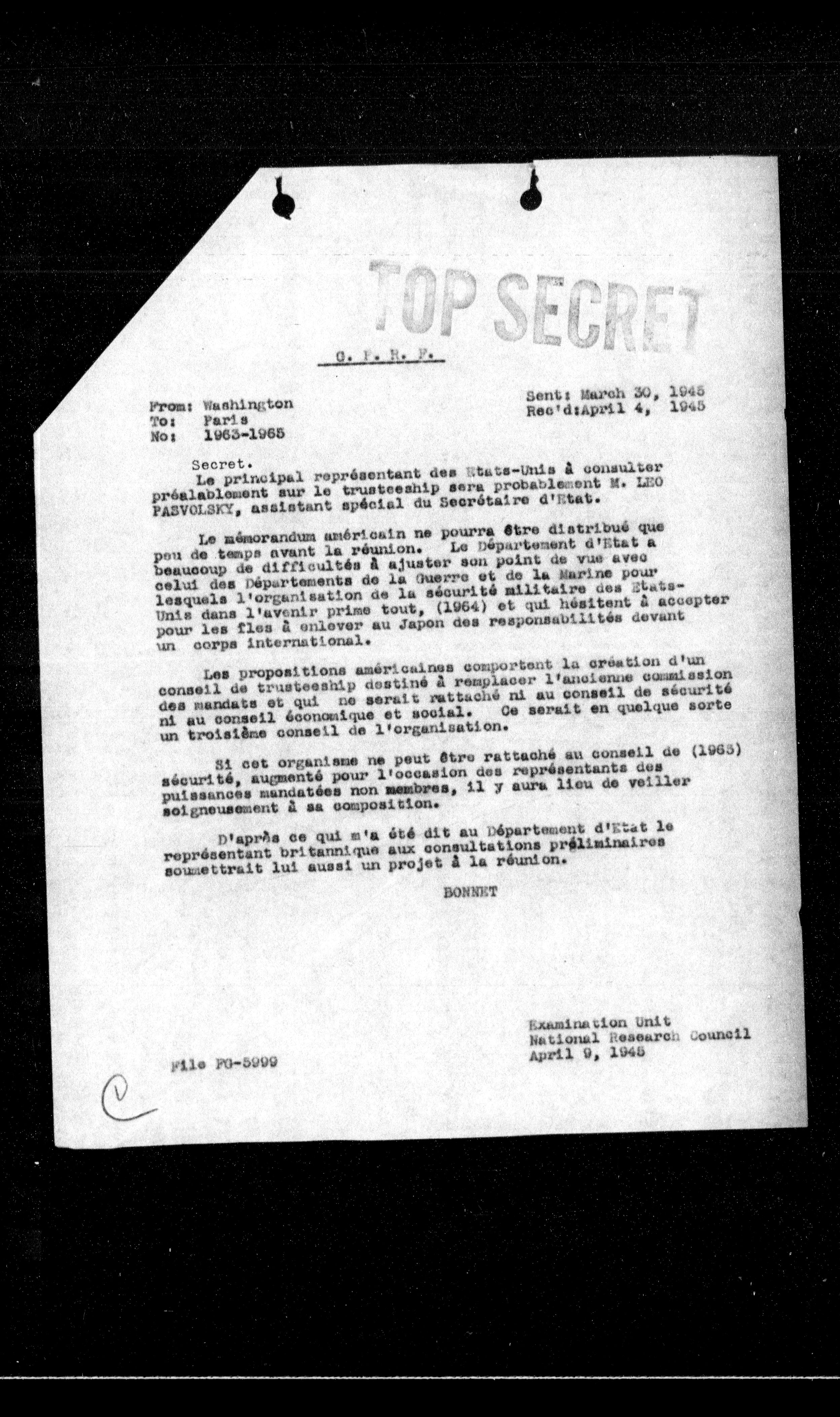 Le memorandum américain ne pourra être distribué que peu de temps avant la réunion. Le Département d'Etat a beaucoup de difficultés à ajuster son point de vue avec celui des Departements de la Guerre et de la Marine pour lesquels l'organisation de la sécurité militaire des EtatsUnis dans l'avenir prime tout, (1964) et qui hésitent à accepter pour les fles à enlever au Japon des responsabilités devant un corps international.