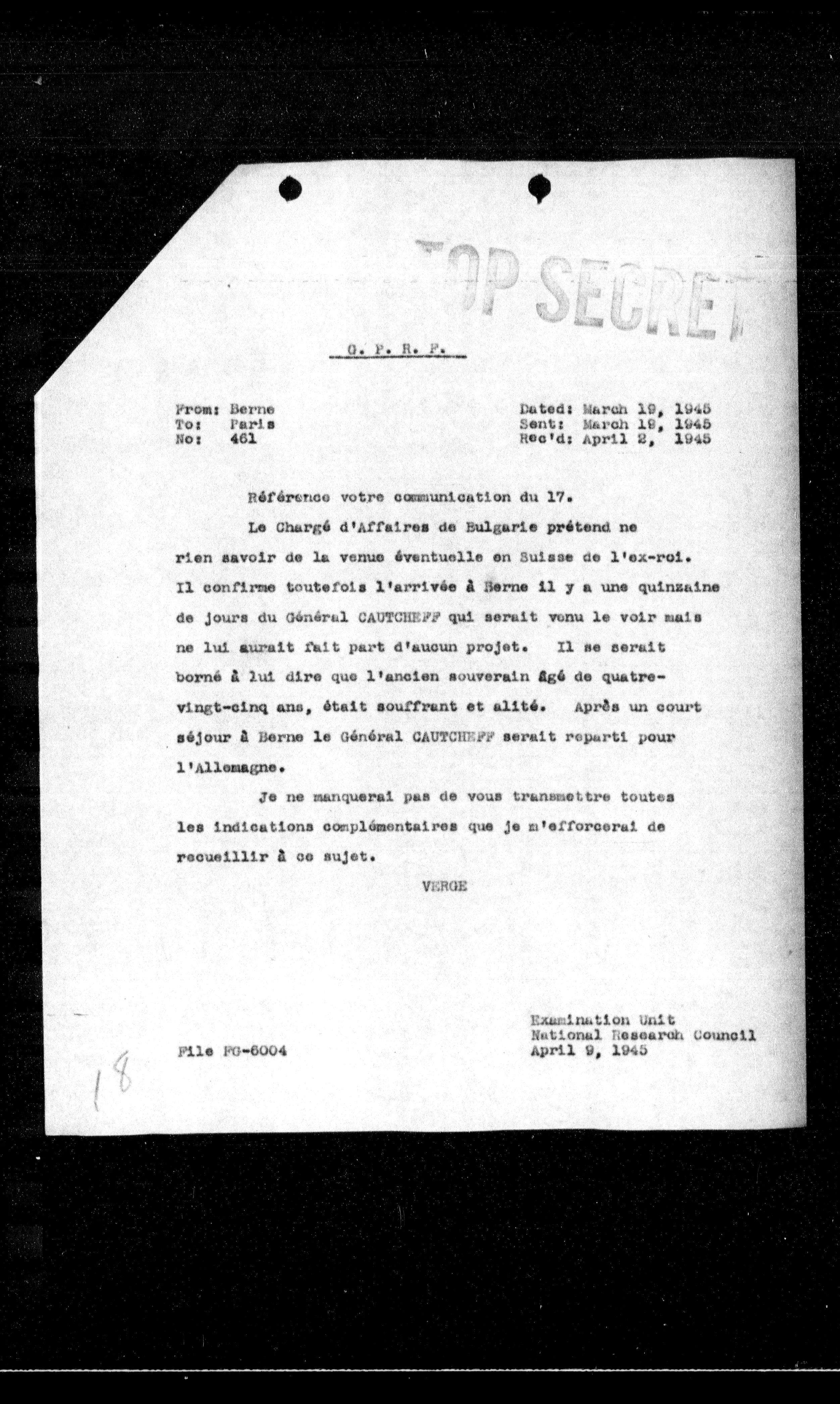 Le Chargé d'Affaires de Bulgarie prétend ne rien savoir de la venue éventuelle en Suisse de l'ex-roi. Il confirme toutefois l'arrivée à Berne il y a une quinzaine de jours du Général CAUTCHEFF qui serait venu le voir mais ne lui aurait fait part d'aucun projet. Il se serait borné à lui dire que l'ancien souverain âgé de quatre-vingt-cinq ans, était souffrant et alité. Après un court séjour à Berne le Général CAUTCHEFF serait reparti pour l'Allemagne.