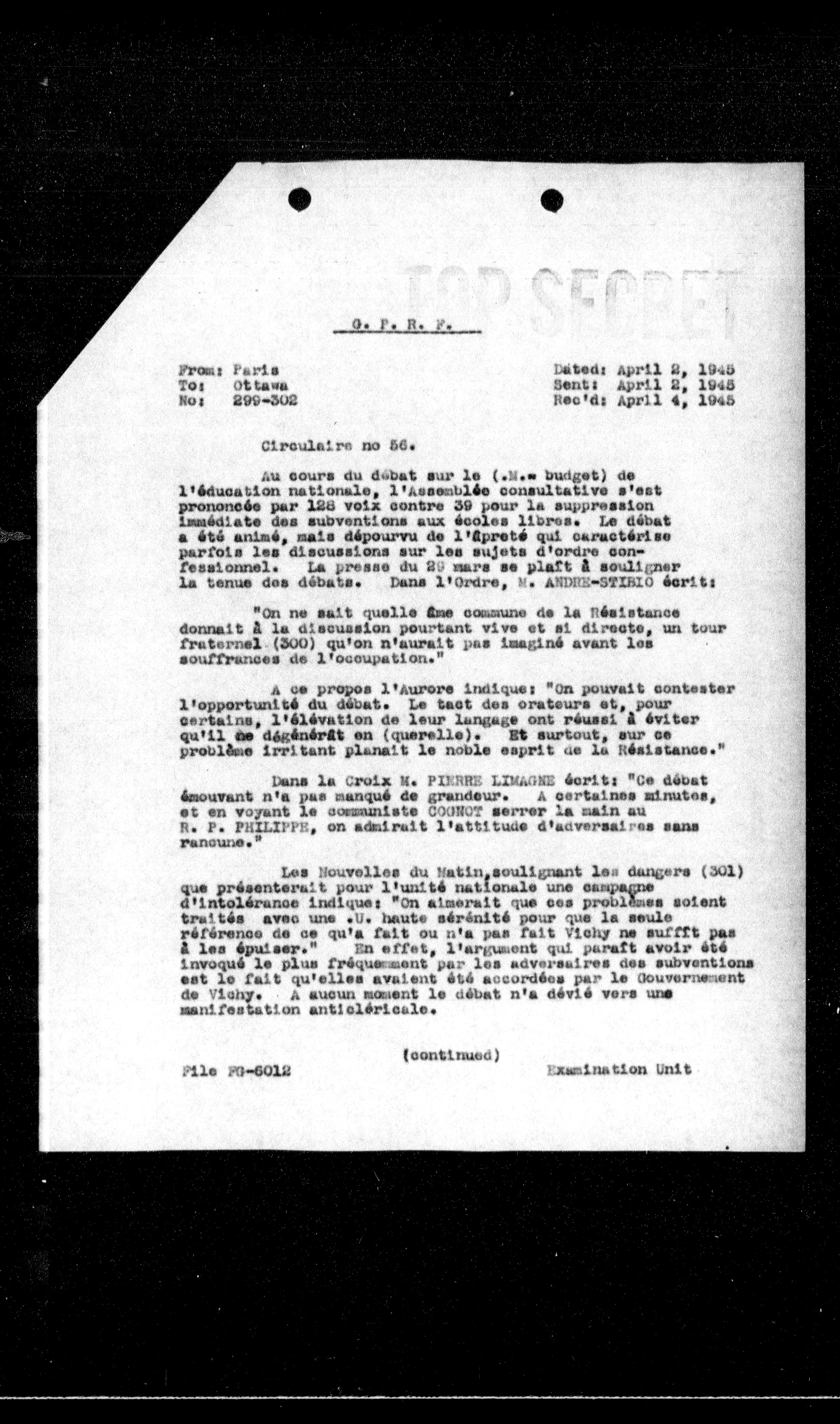 **Dated:** April 2, 1945 **Sent:** April 2, 1945 **Rec'd:** April 4, 1945