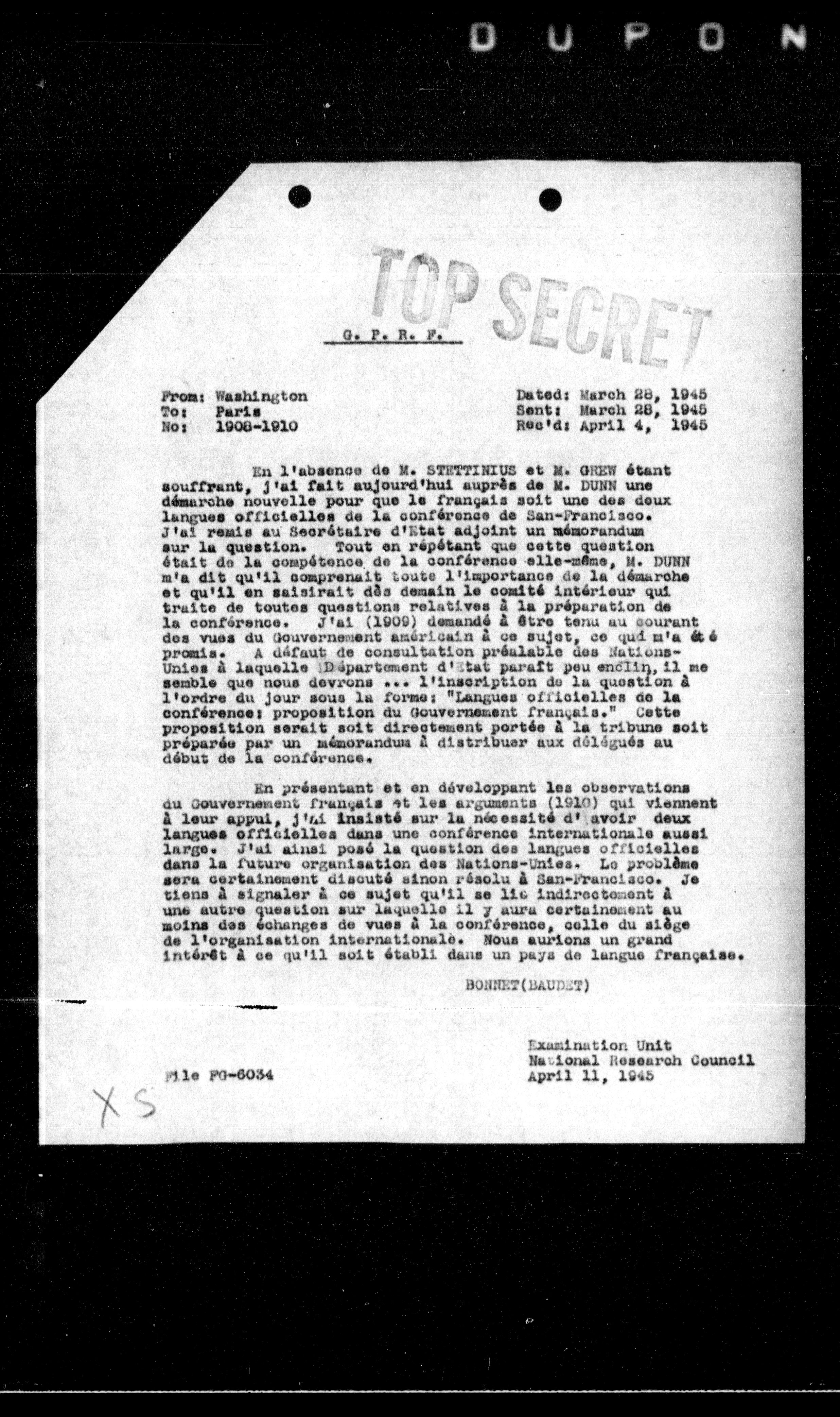En l'absence de M. STETTINIUS et M. GHEW étant souffrant, j'ai fait aujourd'hui auprès de M. DUNN une démarche nouvelle pour que le français soit une des deux langues officielles de la conférence de San-Francisco. J'ai remis au Secrétaire d'Etat adjoint un mémorandum sur la question. Tout en répétant que cette question était de la compétence de la conférence elle-même, M. DUNN m'a dit qu'il comprenait toute l'importance de la démarche et qu'il en saisirait des demain le comité intérieur qui traite de toutes questions relatives à la préparation de la conférence. J'ai (1909) demandé à être tenu au courant des vues du Gouvernement américain à ce sujet, ce quá m'a été promis. A défaut de consultation préalable des NationsUnies à laquelle l'Hépartement d'Etat paraît peu enclin, il me semble que nous devrons ... l'inscription de la question à l'ordre du jour sous la forme: "Langues officielles de la conférence: proposition du Gouvernement français." Cette proposition serait soit directement portée à la tribune soit préparée par un mémorandum à distribuer aux délégués au début de la conférence.