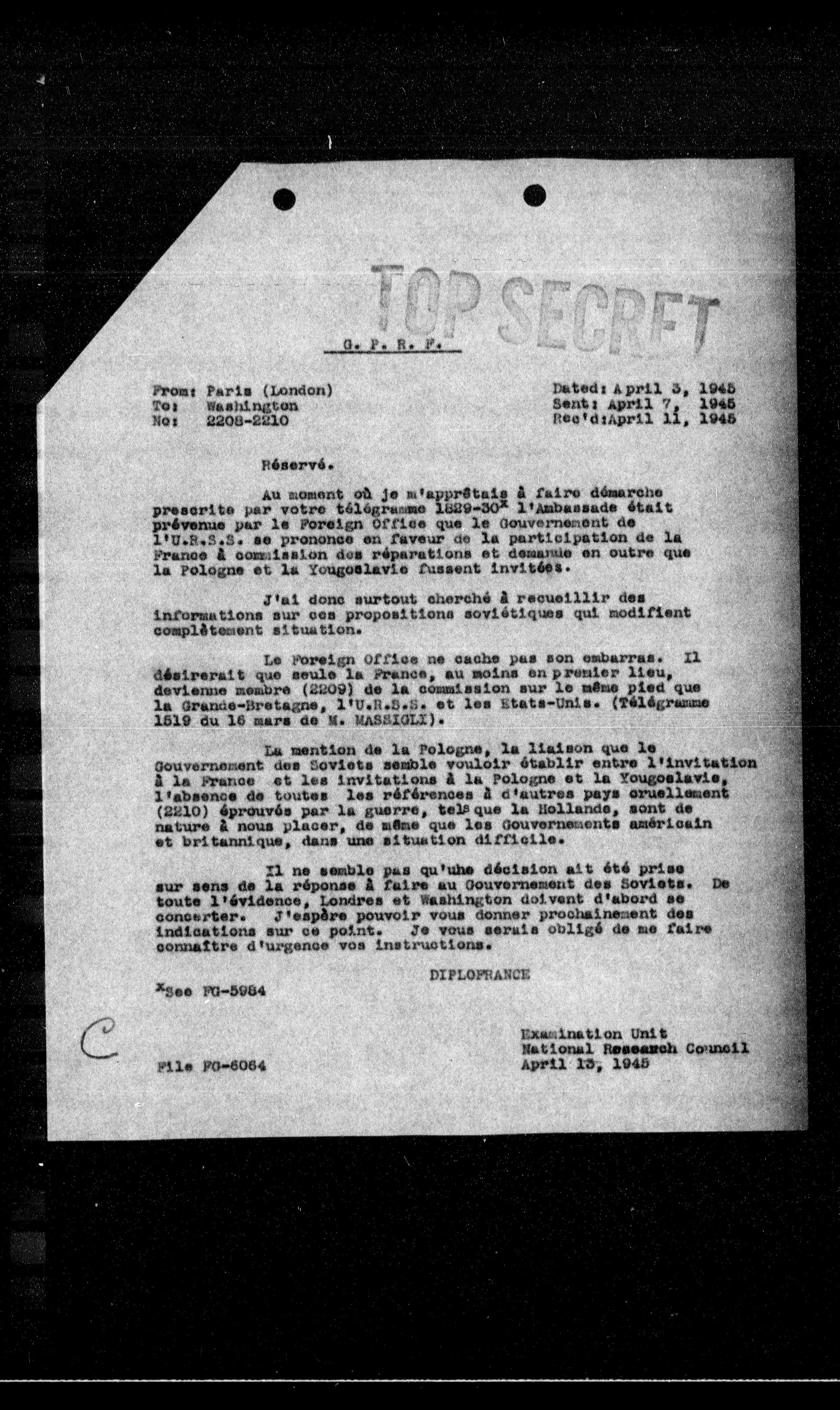 Le Foreign Office ne cache pas son embarras. Il désirerait que seule la France, au moins en premier lieu, devienne membre (2209) de la commission sur le même pied que la Grande-Bretagne, l'U.R.S.S. et les États-Unis. (Télégramme 1519 du 16 mars de M. MARRIOLI).
