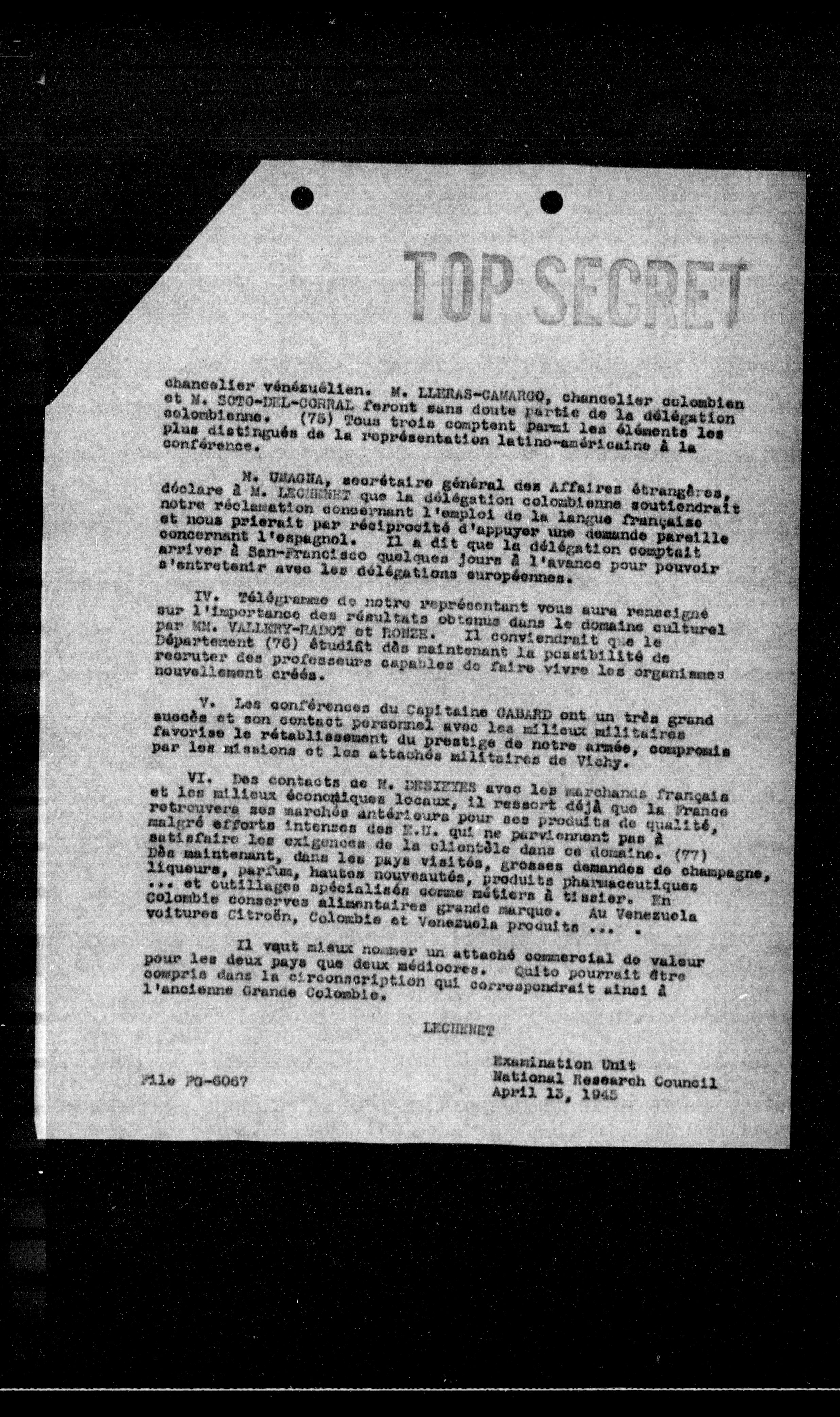 chancelier vénésuelien. M. LLEUAS-CANARCO, chancelier colombien et M. SOTO-DEL-CORRAL feront sans doute partie de la délégation colombienne. (75) Tous trois comptent parmi les éléments les plus distingués de la représentation latino-américaine à la conférence.