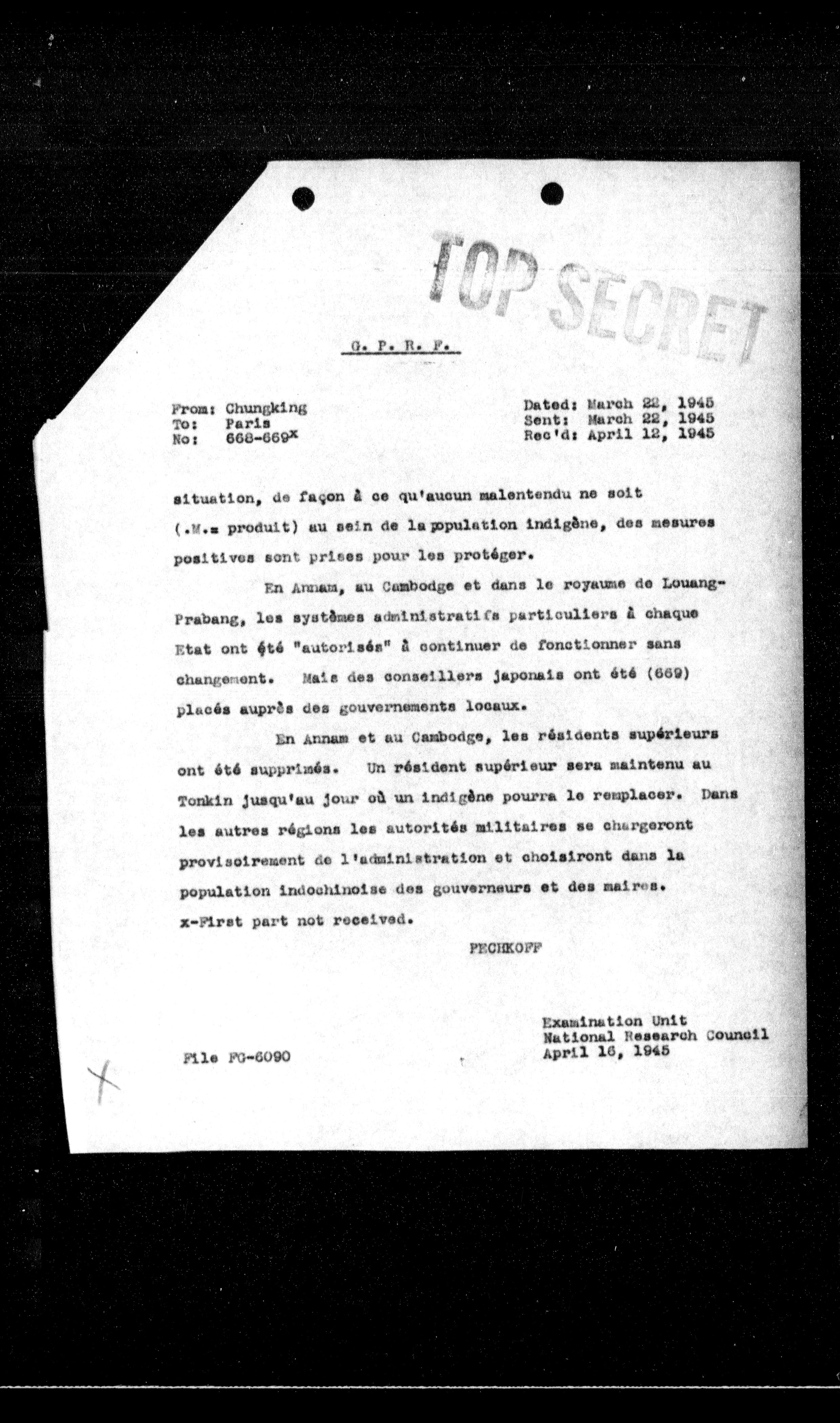 En Annam et au Cambodge, les résidents supérieurs ont été supprimés. Un résident supérieur sera maintenu au Tonkin jusqu'au jour où un indigène pourra le remplacer. Dans les autres régions les autorités militaires se chargeront provisoirement de l'administration et choisiront dans la population indochinoise des gouverneurs et des maires. x - First part not received.