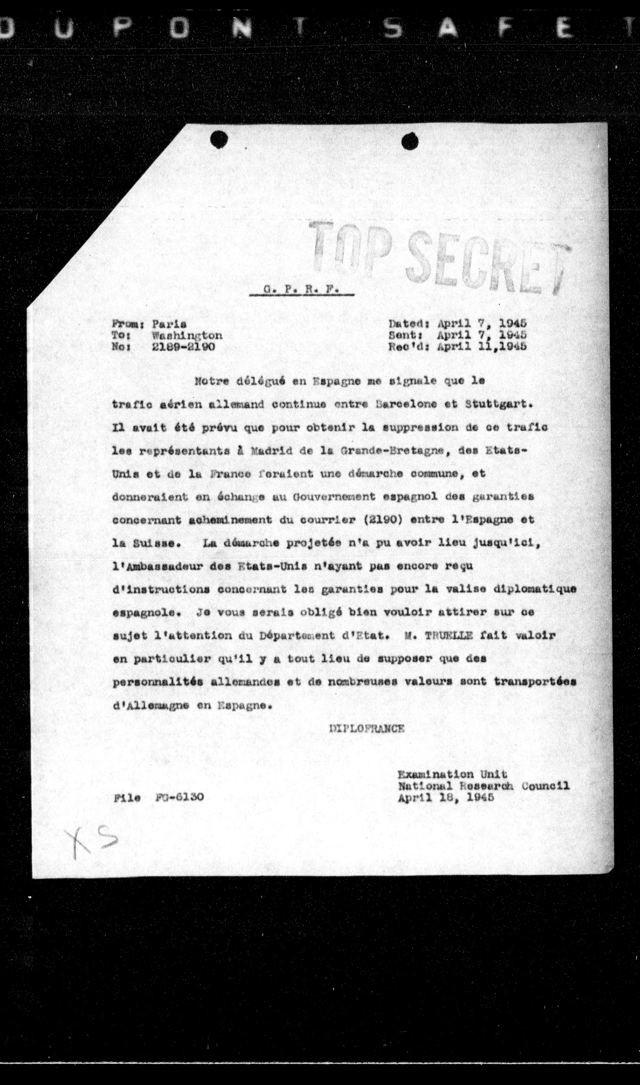 Notre délégué en Espagne me signale que le trafic aérien allemand continue entre Barcelone et Stuttgart. Il avait été prévu que pour obtenir la suppression de ce trafic les représentants à Madrid de la Grande-Bretagne, des Etats-Unis et de la France seraient une démarche commune, et donneraient en échange au Gouvernement espagnol des garanties concernant acheminement du courrier (2190) entre l'Espagne et la Suisse. La démarche projetée n'a pu avoir lieu jusqu'ici, l'Ambassadeur des Etats-Unis n'ayant pas encore reçu d'instructions concernant les garanties pour la valise diplomatique espagnole. Je vous serais obligé bien vouloir attirer sur ce sujet l'attention du Département d'Etat. M. TRUELLE fait valoir en particulier qu'il y a tout lieu de supposer que des personnalités allemandes et de nombreuses valeurs sont transportées d'Allemagne en Espagne.