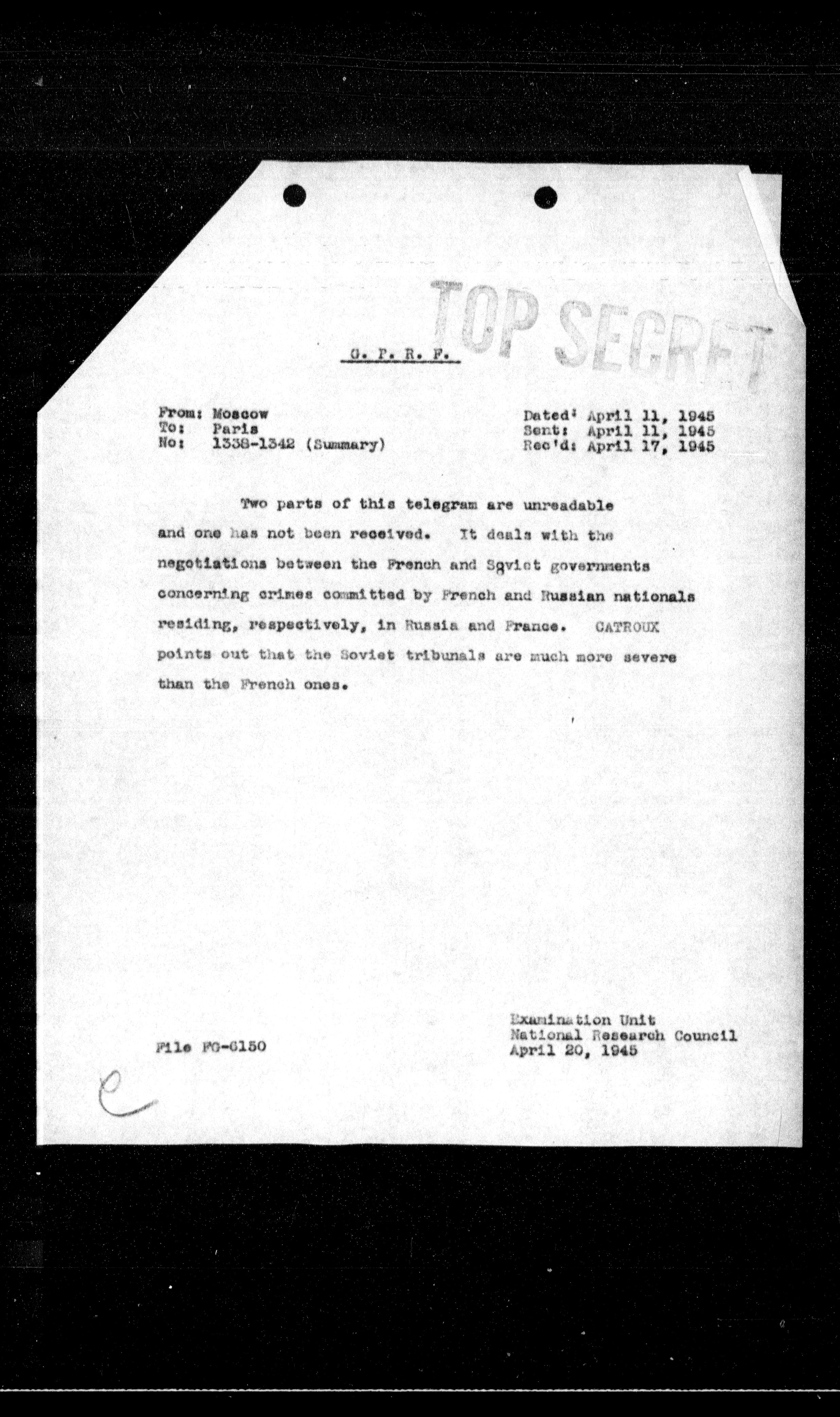 Two parts of this telegram are unreadable and one has not been received. It deals with the negotiations between the French and Sgviet governments concerning crimes committed by French and Russian nationals residing, respectively, in Russia and France. GATROUX points out that the Soviet tribunals are much more severe than the French ones.