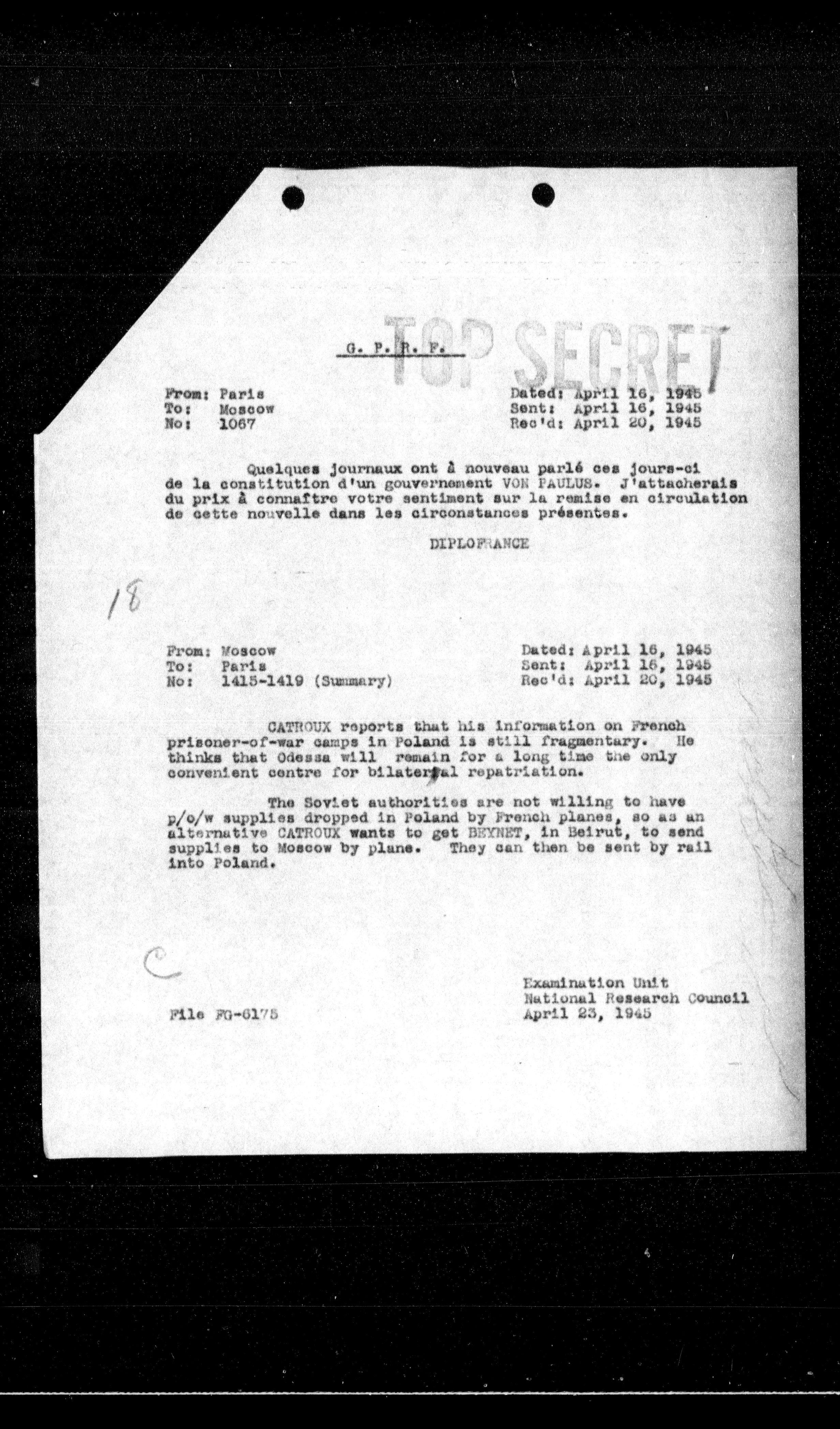**From:** Paris **To:** Moscow **No:** 1067