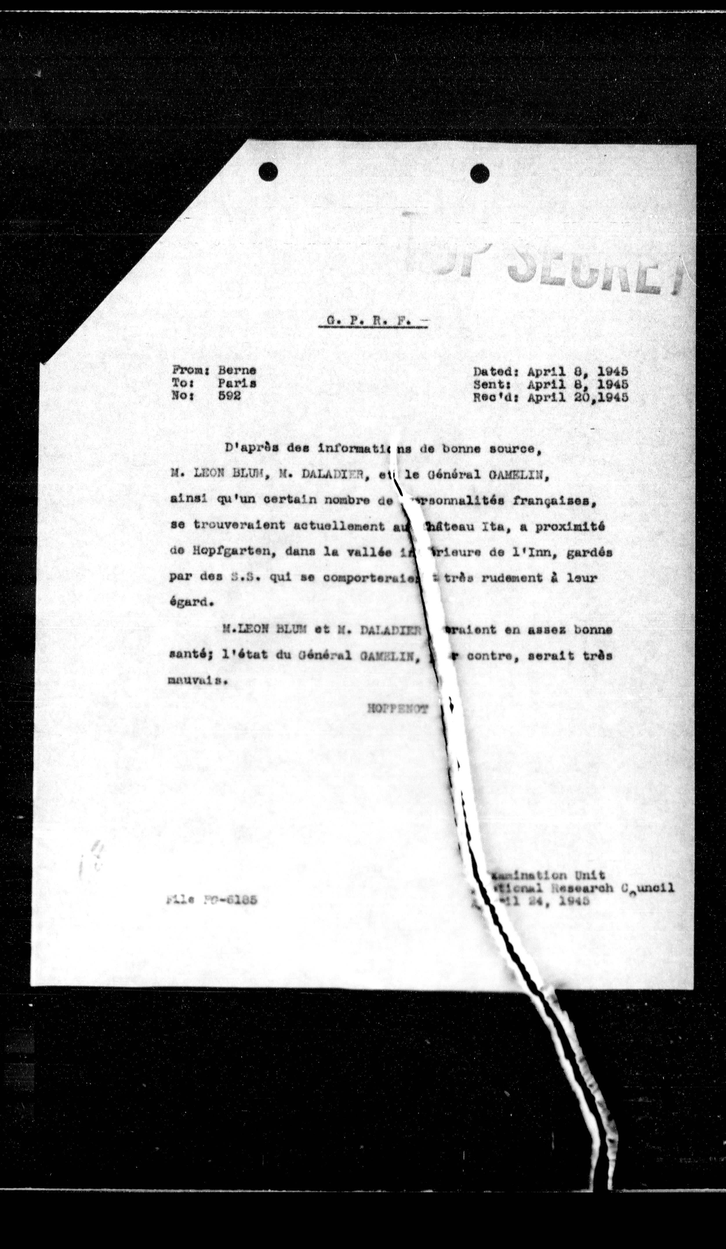D'après des informations de bonne source, M. LEON BLUM, M. DALABIER, et le Général GAMELIN, ainsi qu'un certain nombre de personnalités françaises, se trouveraient actuellement au château Ita, a proximité de Hopfgarten, dans la vallée la rivière de l'Inn, gardés par des S.S. qui se comporteraient très rudement à leur égard.