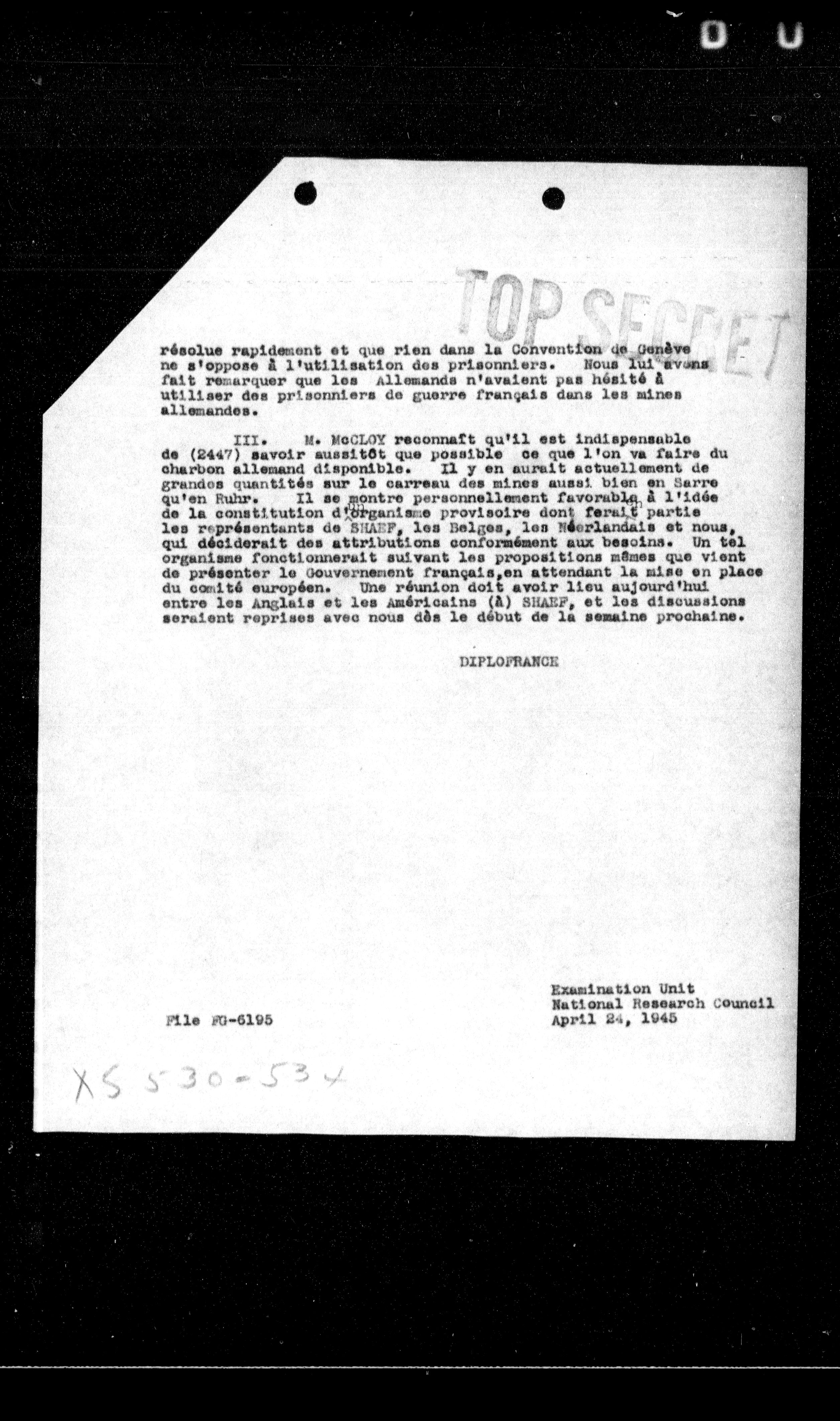 III. M. McCLOY reconnaît qu'il est indispensable de (2447) savoir aussitôt que possible ce que l'on va faire du charbon allemand disponible. Il y en aurait actuellement de grandes quantités sur le carreau des mines aussi bien en Serre qu'en Ruhr. Il se montre personnellement favorable à l'idée de la constitution d'organisme provisoire dont ferait partie les représentants de SHAFF, les Belges, les Sécrlandais et nous, qui déciderait des attributions conformément aux besoins. Un tel organisme fonctionnerait suivant les propositions mêmes que vient de présenter le Gouvernement français, en attendant la mise en place du comité européen. Une réunion doit avoir lieu aujourd'hui entre les Anglais et les Américains (à) SHAFF, et les discussions seraient reprises avec nous dès le début de la semaine prochaine.