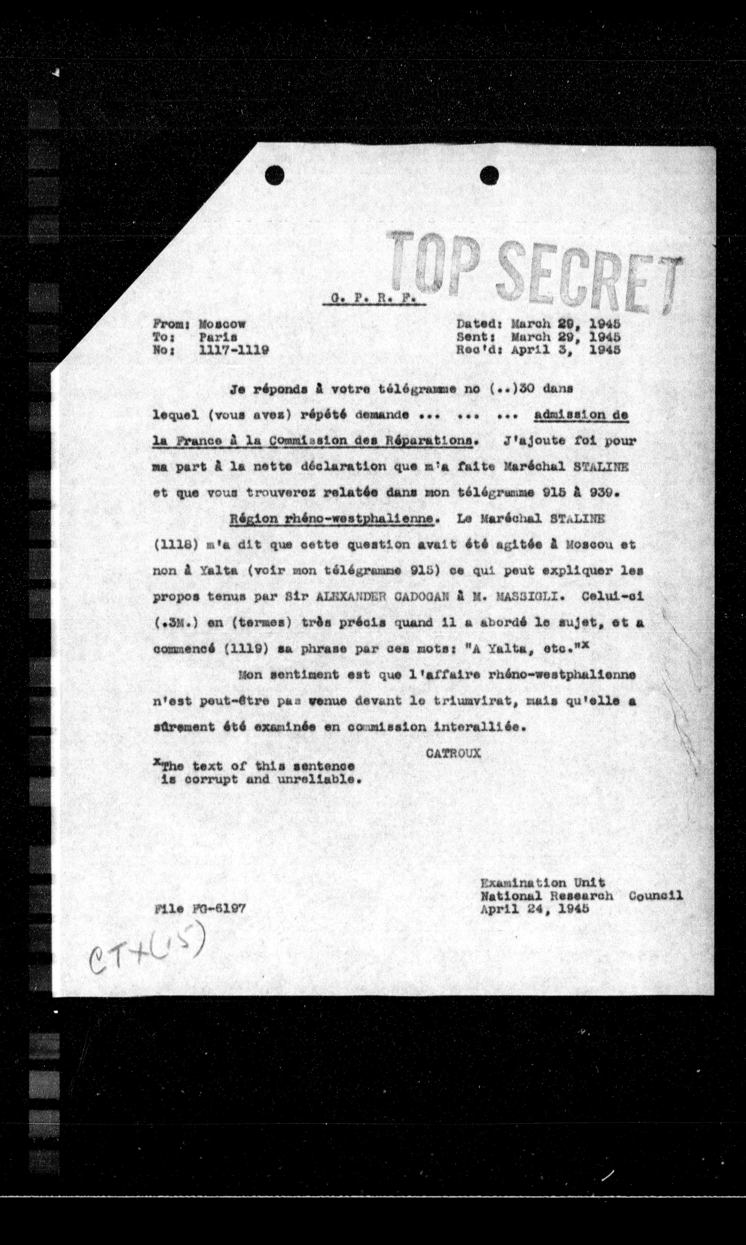 Région rhéno-westphalienne. Le Maréchal STALINE (1115) m'a dit que cette question avait été agitée à Moscou et non à Yalta (voir mon télégramme 915) ce qui peut expliquer les propos tenus par Sir ALKXANDER CADOGAN à M. MASSIGLI. Celui-ci (.3N.) en (termes) très précis quand il a abordé le sujet, et a commencé (1119) sa phrase par ces mots: "A Yalta, etc."x