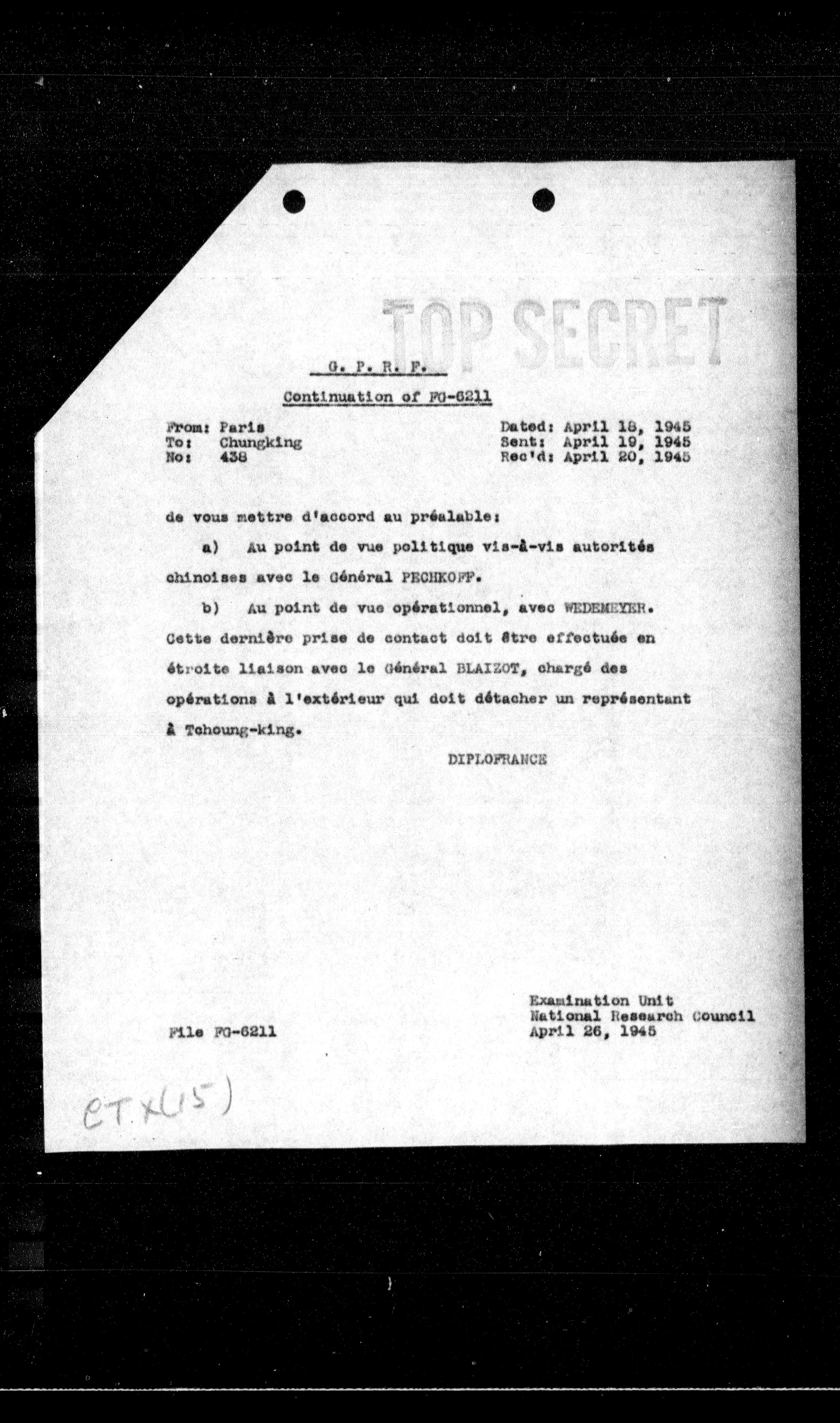 b) Au point de vue opérationnel, avec WEDEMEYER. Cette dernière prise de contact doit être effectuée en étroite liaison avec le général BLAIZOT, chargé des opérations à l'extérieur qui doit détacher un représentant à Tehcung-king.