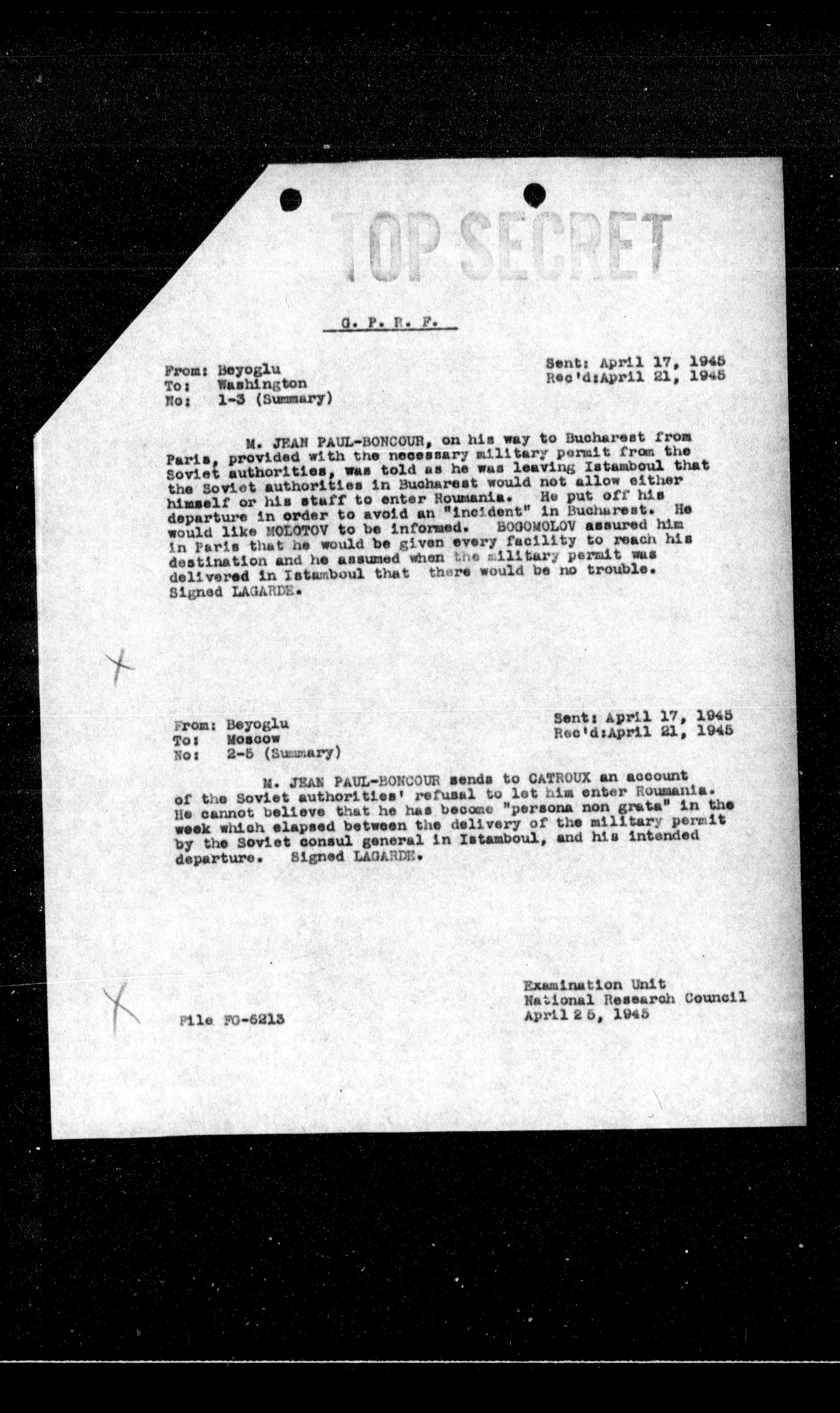 M. JEAN PAUL-BONCOUR, on his way to Bucharest from Paris, provided with the necessary military permit from the Soviet authorities, was told as he was leaving Istamboul that the Soviet authorities in Bucharest would not allow either himself or his staff to enter Roumania. He put off his departure in order to avoid an "incident" in Bucharest. He would like BOLOTOV to be informed. BOGOWOLOV assured him in Paris that he would be given every facility to reach his destination and he assumed when the military permit was delivered in Istamboul that there would be no trouble.