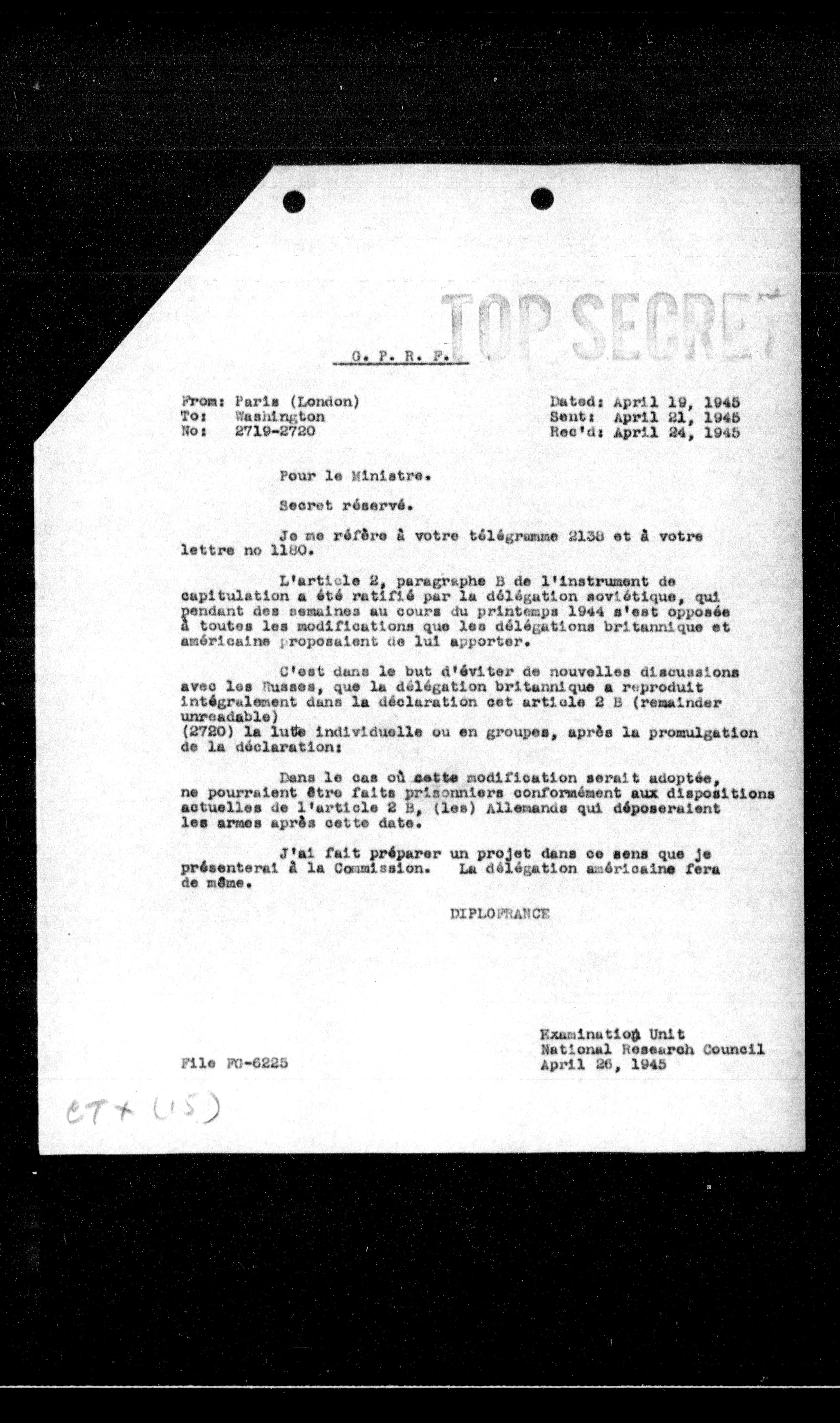 L'article 2, paragraphe B de l'instrument de capitulation a été ratifié par la délégation soviétique, qui pendant des semaines au cours du printemps 1944 s'est opposée à toutes les modifications que les délégations britannique et américaine proposaient de lui apporter.
