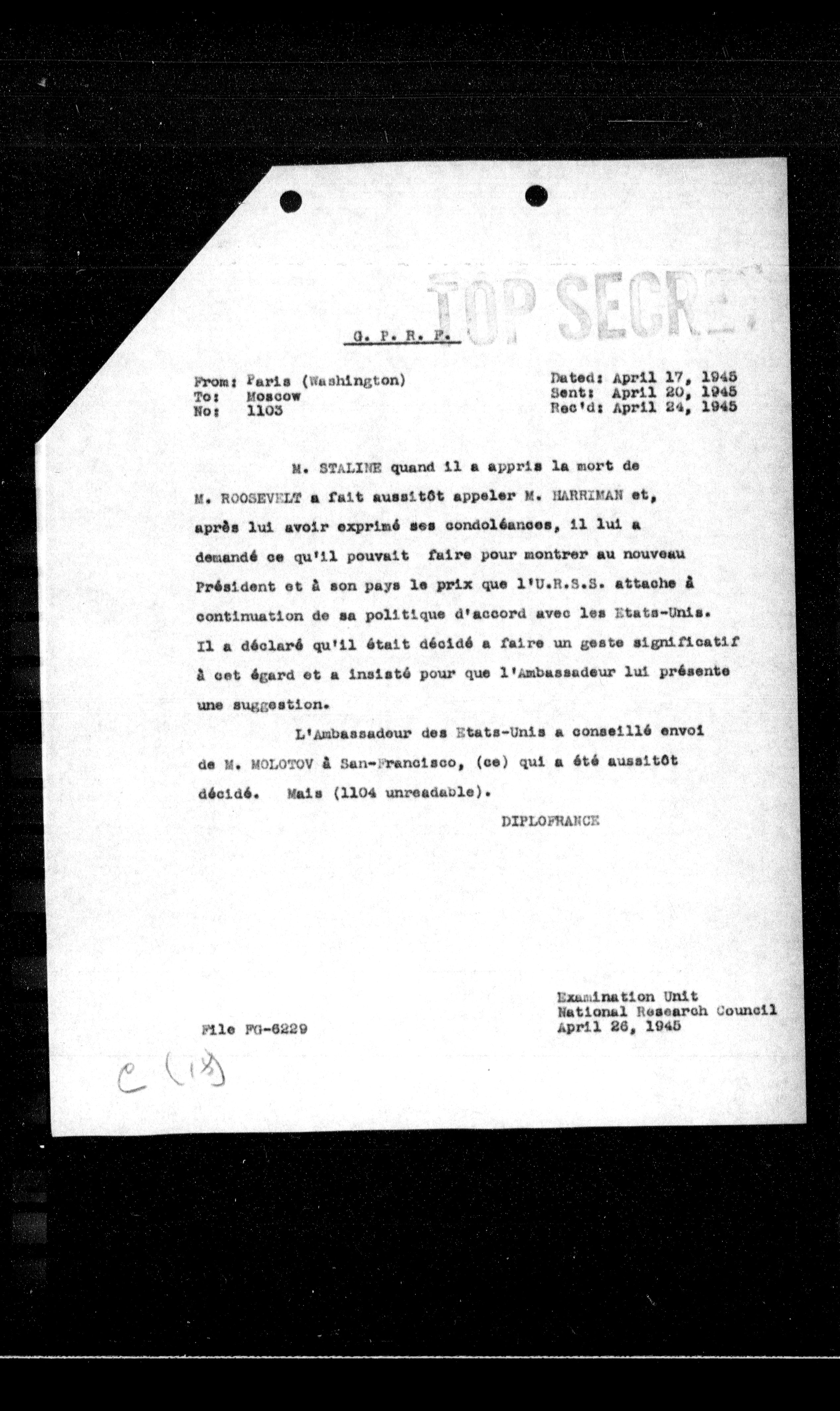 L'ambassadeur des Etats-Unis a conseillé envoi de M. MOLOTOV à San-Francisco, (ce) qui a été aussitôt décidé. Mais (1104 unreadable).