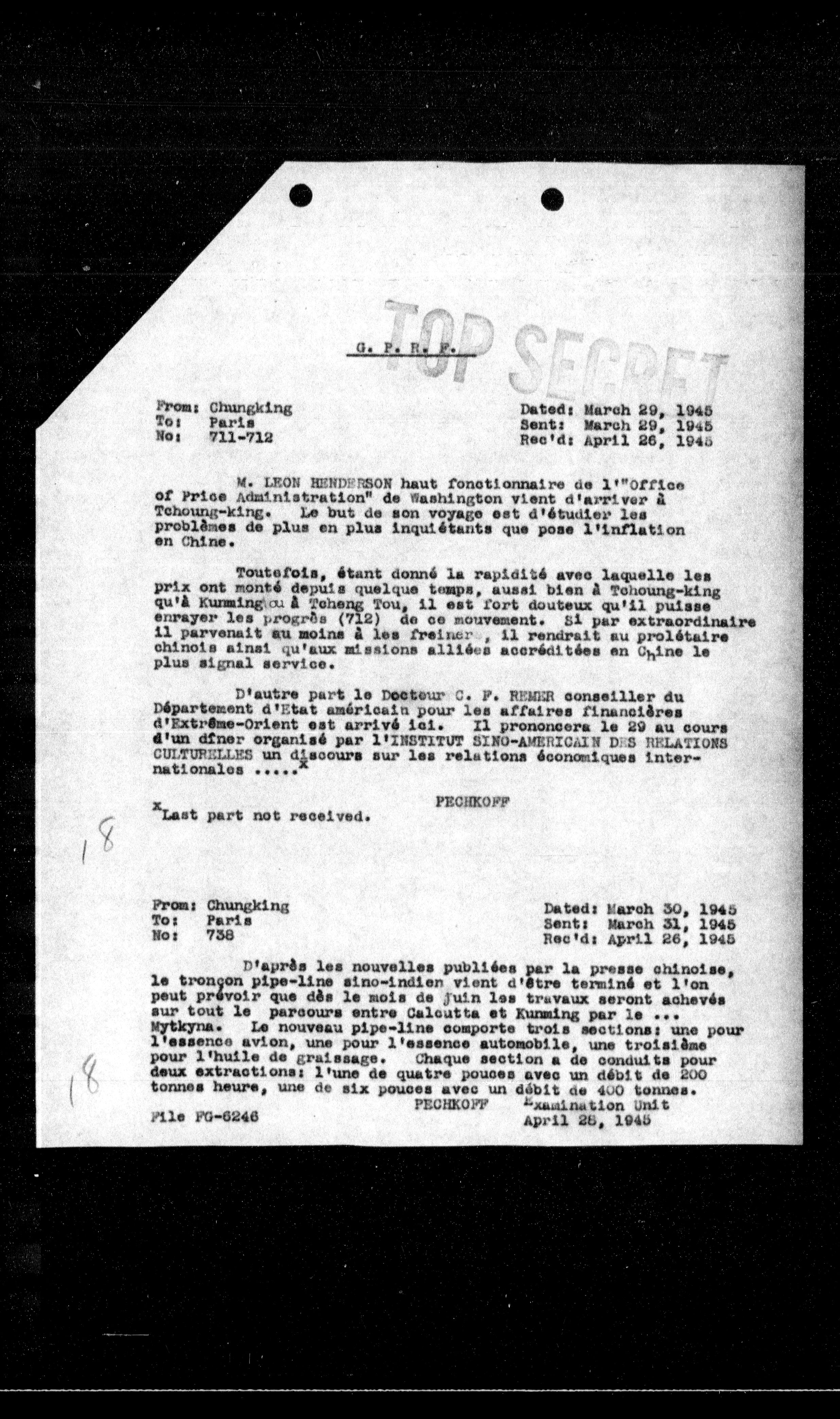 M. LEON HENDERSON, haut fonctionnaire de l'office d'Price Administration de Washington vient d'arriver à Tchoung-king. Le but de son voyage est d'étudier les problèmes de plus en plus inquiétants que pose l'inflation en Chine.