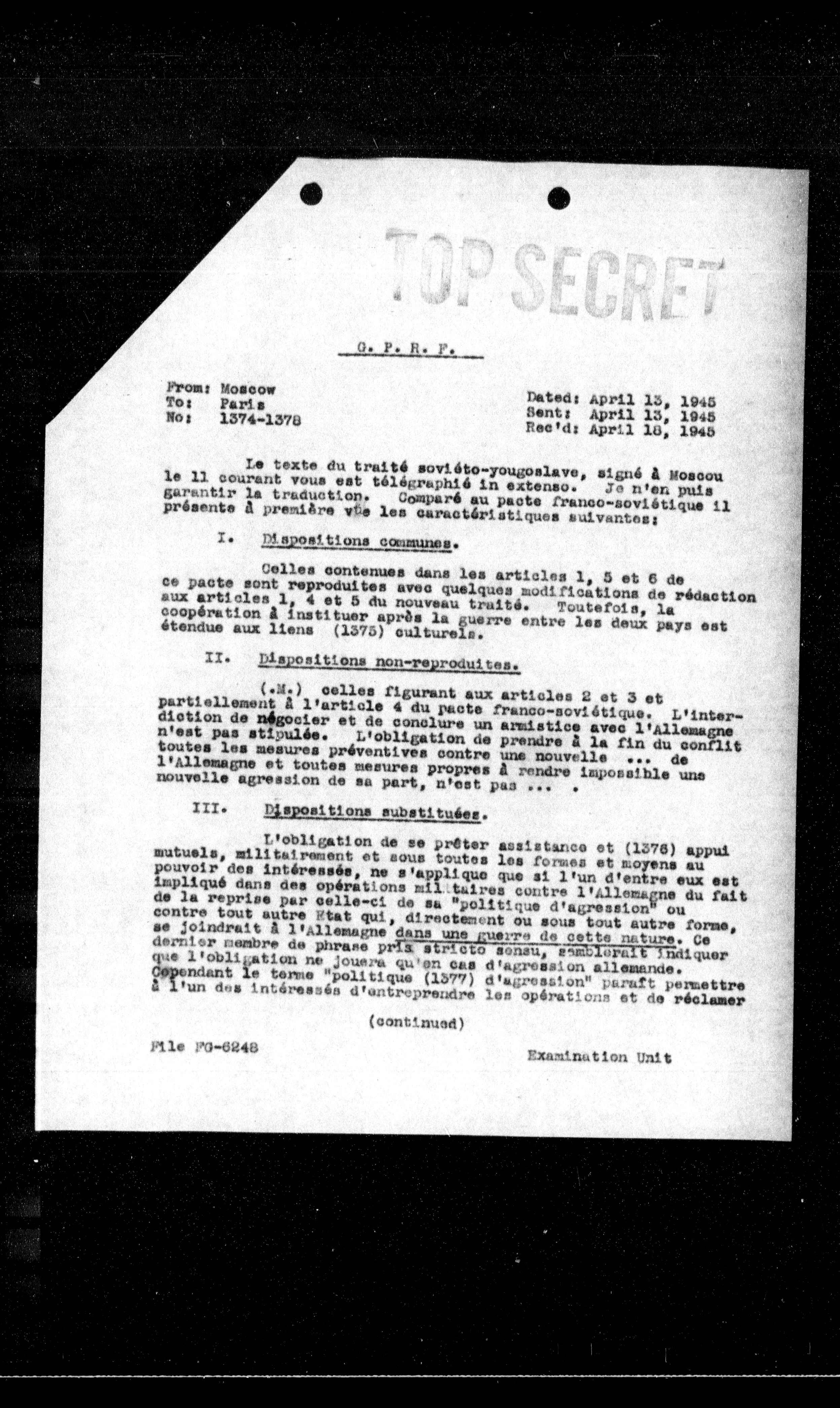 Le texte du traité soviéto-yougoslave, signé a Moscou le 11 courant vous est telégraphié in extenso. Je n'en puis garantir la traduction. Comparé au pacte franco-soviétique il présente a première vile les caractéristiques suivantes:
