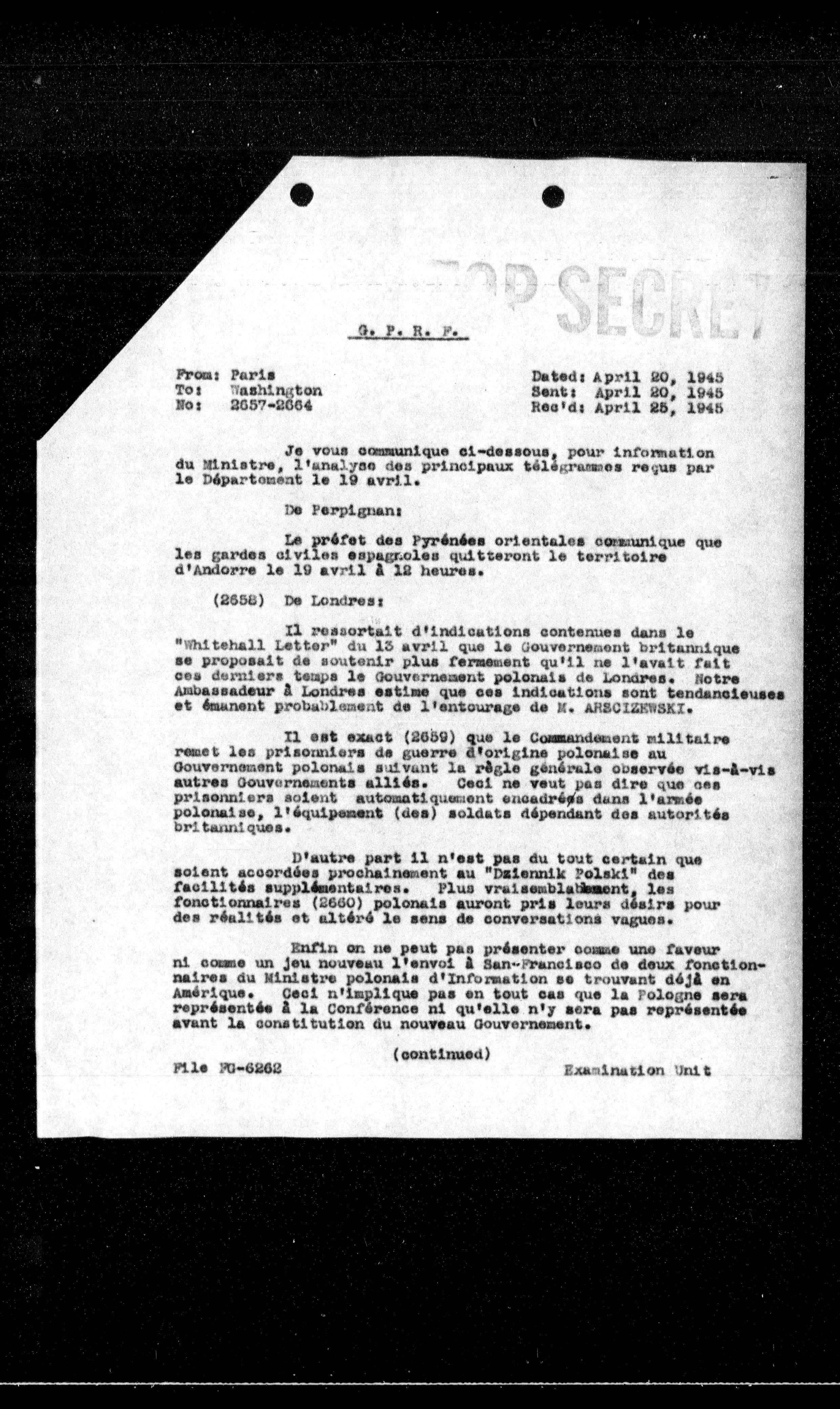 Enfin on ne peut pas présenter comme une faveur ni comme un jeu nouveau l'envoi à San-Francisco de deux fonctionnaires du Ministre polonais d'Information se trouvant déjà en Amérique. Ceci n'implique pas en tout cas que la Pologne sera représentée à la conférence ni qu'elle n'y sera pas représentée avant la constitution du nouveau Gouvernement.