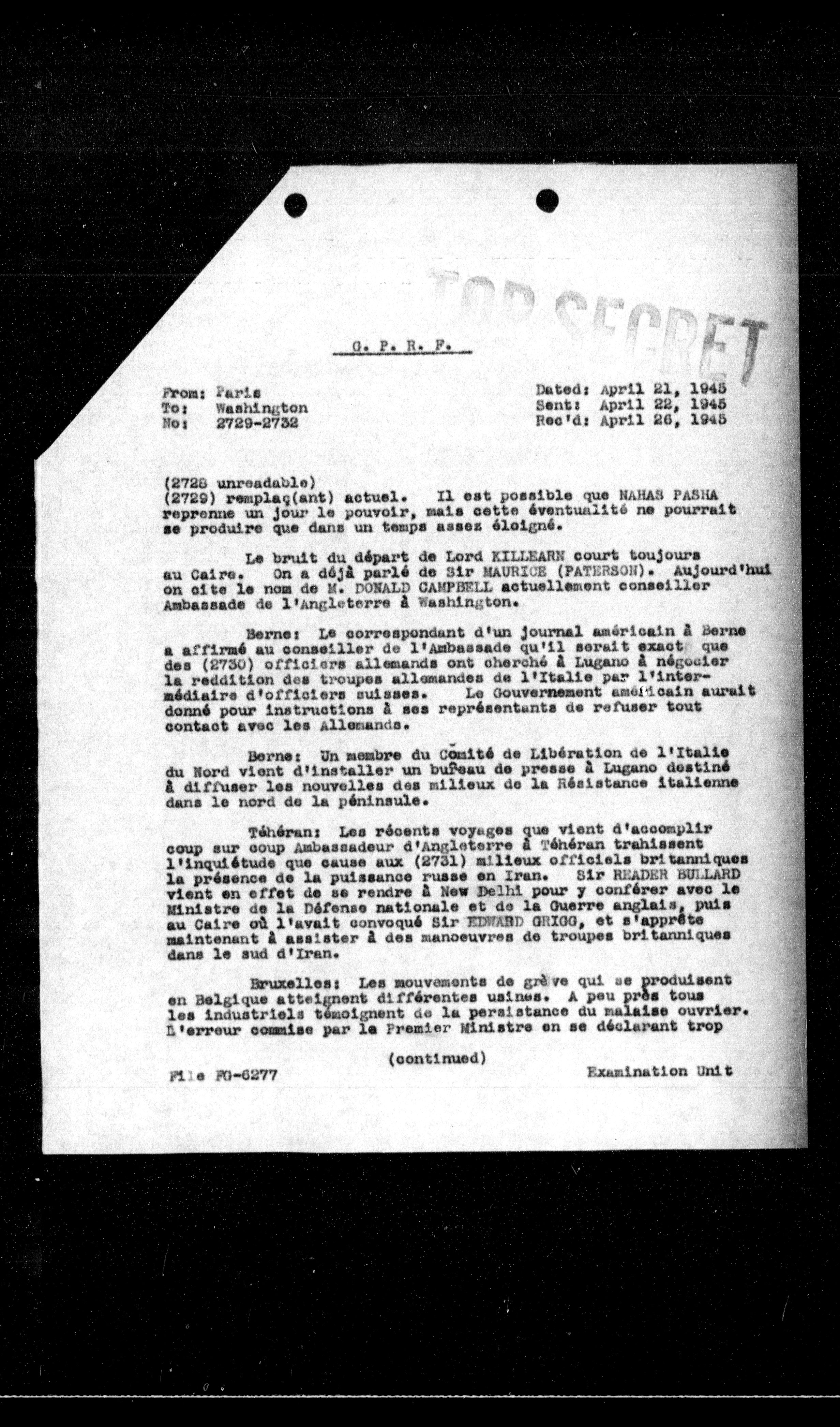 **Berne:** Le correspondant d'un journal américain à Berne a affirmé au conseiller de l'Ambassade qu'il serait exact que des (2730) officiers allemands ont cherché à Lugano à négocier la reddition des troupes allemandes de l'Italie par l'intermédiaire d'officiers suisses. Le Gouvernement américain aurait donné pour instructions à ses représentants de refuser tout contact avec les allemands.