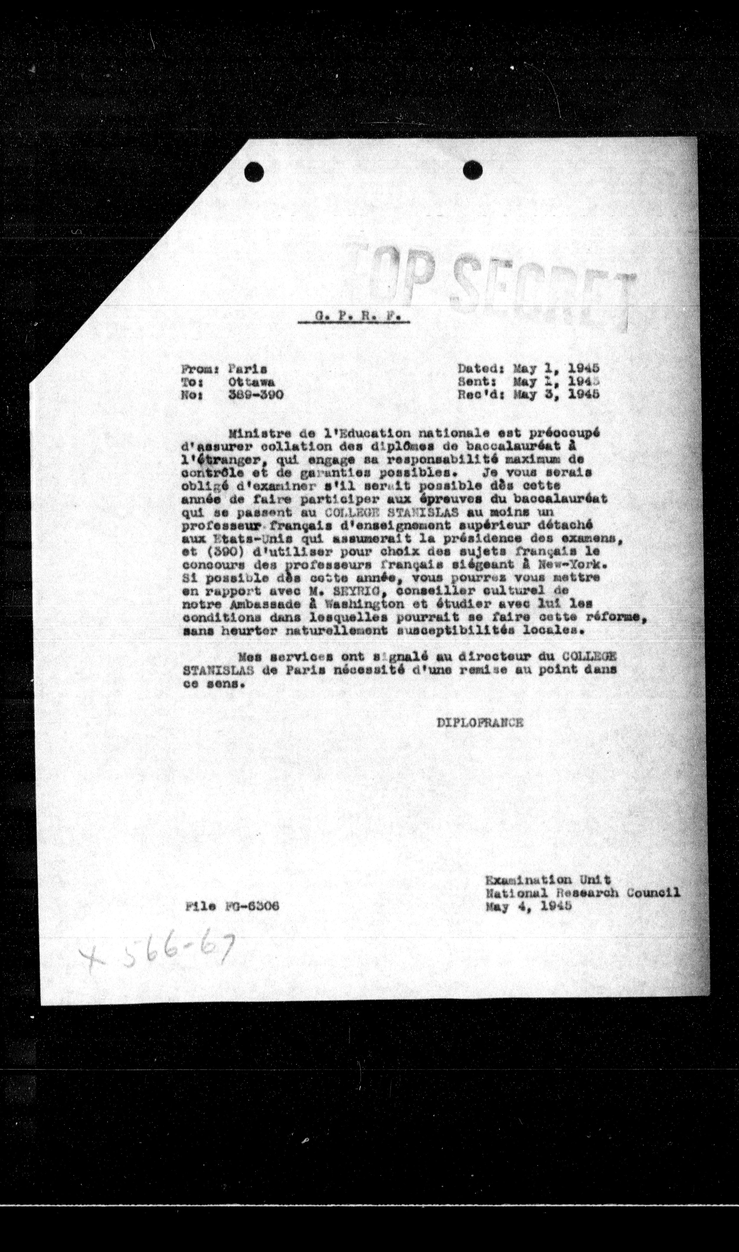 Ministre de l'Education nationale est préoccupé d'assurer collation des diplômes de baccalauréat à l'étranger, qui engage sa responsabilité maximum de contrôle et de garanties possibles. Je vous serais obligé d'examiner s'il serait possible des cette année de faire participer aux épreuves du baccalauréat qui se passent au COLLEGE STANISLAS au moins un professeur français d'enseignement supérieur détaché aux Etats-Unis qui assumerait la présidence des examens, et (390) d'utiliser pour choix des sujets français le concours des professeurs français siégeant à New-York. Si possible des cette année, vous pourrez vous mettre en rapport avec M. SEYNIO, conseiller culturel de notre ambassade à Washington et étudier avec lui les conditions dans lesquelles pourrait se faire cette réforme, sans heurter naturellement susceptibilités locales.