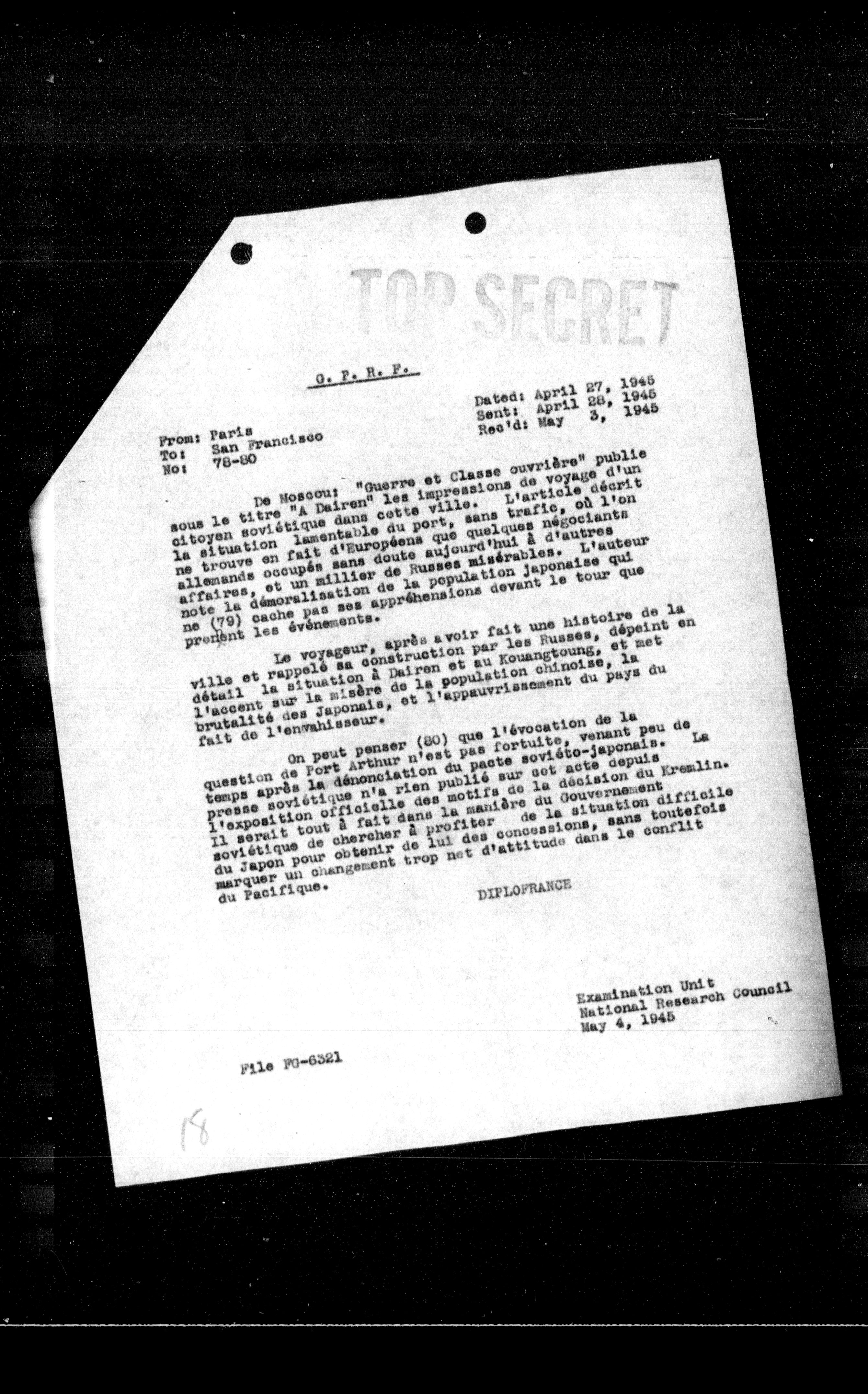 On peut penser (80) que l'évocation de la question de Port Arthur n'est pas fortuite, venant peu de temps après la dénonciation du paste soviéto-japonais. Lesle presse soviétique n'a rien publié sur cet acte depuis l'exposition officielle des motifs de la décision du Kremlin. Il serait tout à fait dans la manière du Gouvernement soviétique de chercher à profiter de la situation difficile du Japon pour obtenir de lui des concessions, sans toutefois marquer un changement trop net d'attitude dans le conflit du Pacifique.