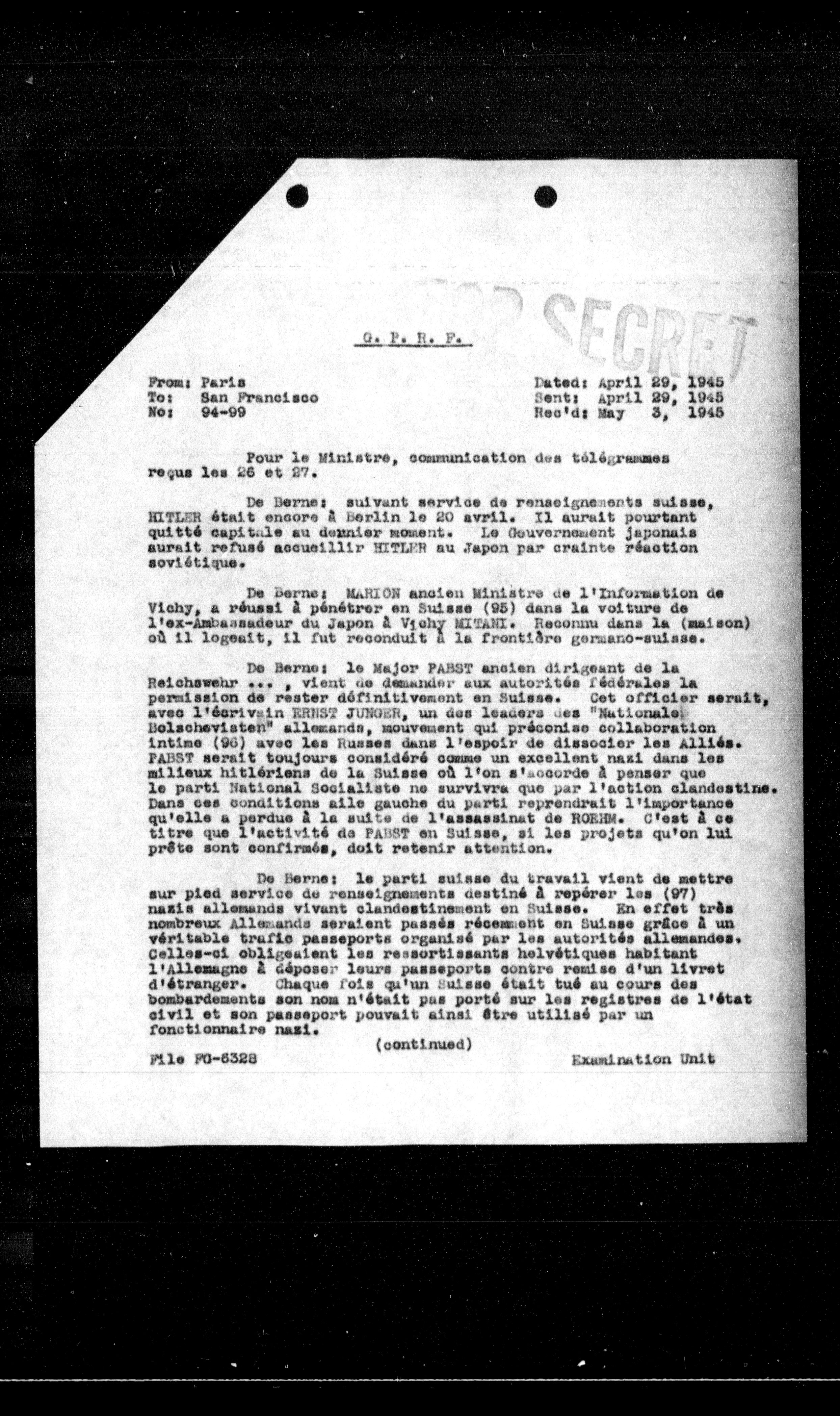 De Berne: suivant service de renseignements suisse, HITLER était encore a Berlin le 20 avril. Il aurait pourtant quitté capitule au demier moment. Le Gouvernement japonais aurait refusé accueillir MITLER au Japon par crainte réaction soviétique.