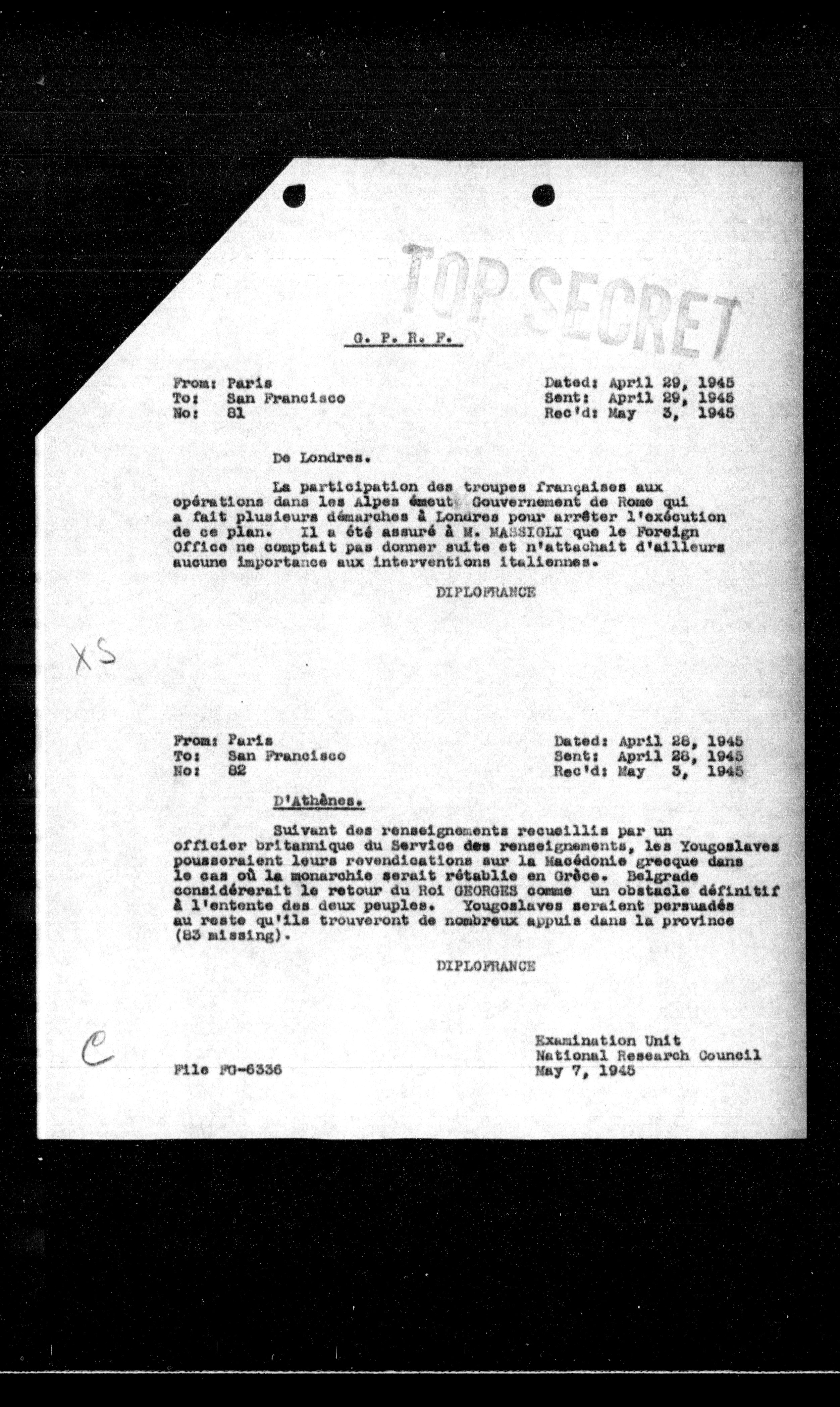 Suivant des renseignements recueillis par un officier britannique du Service des renseignements, les Yougoslaves pousseraient leurs revendications sur la Macédoine grecque dans le cas où la monarchie serait rétablie en Grèce. Belgrade considérerait le retour du Roi GEORGES comme un obstacle définitif à l'entente des deux peuples. Yougoslaves seraient persuadés au reste qu'ils trouveront de nombreux appuis dans la province (83 missing).