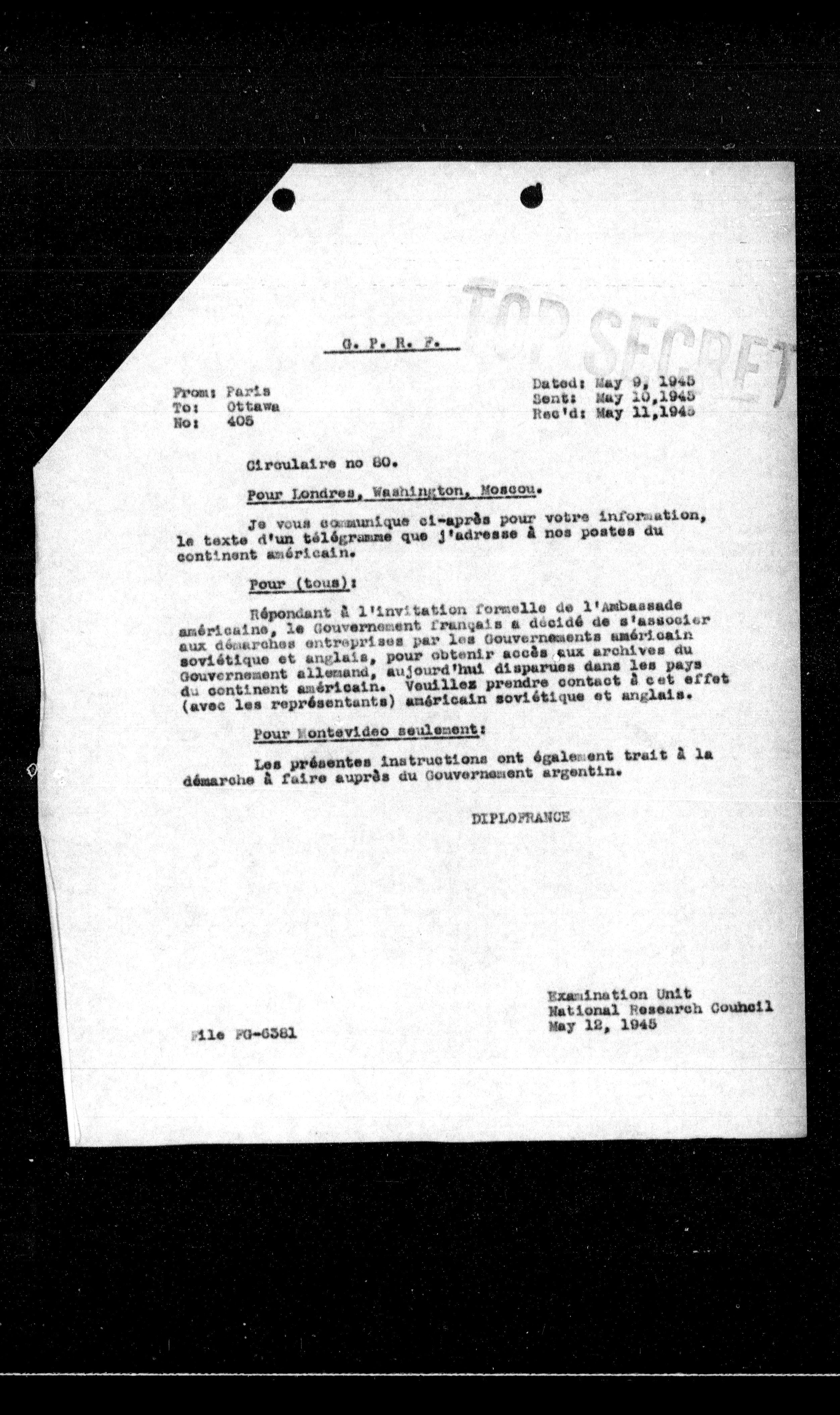 Répondant à l'invitation formelle de l'ambassade américaine, le Gouvernement français a décidé de s'associer aux démarches entreprises par les Gouvernements américain soviétique et anglais, pour obtenir accès aux archives du Gouvernement allemand, aujourd'hui disparues dans les pays du continent américain. Veuillez prendre contact à cet effet (avec les représentants) américain soviétique et anglais.