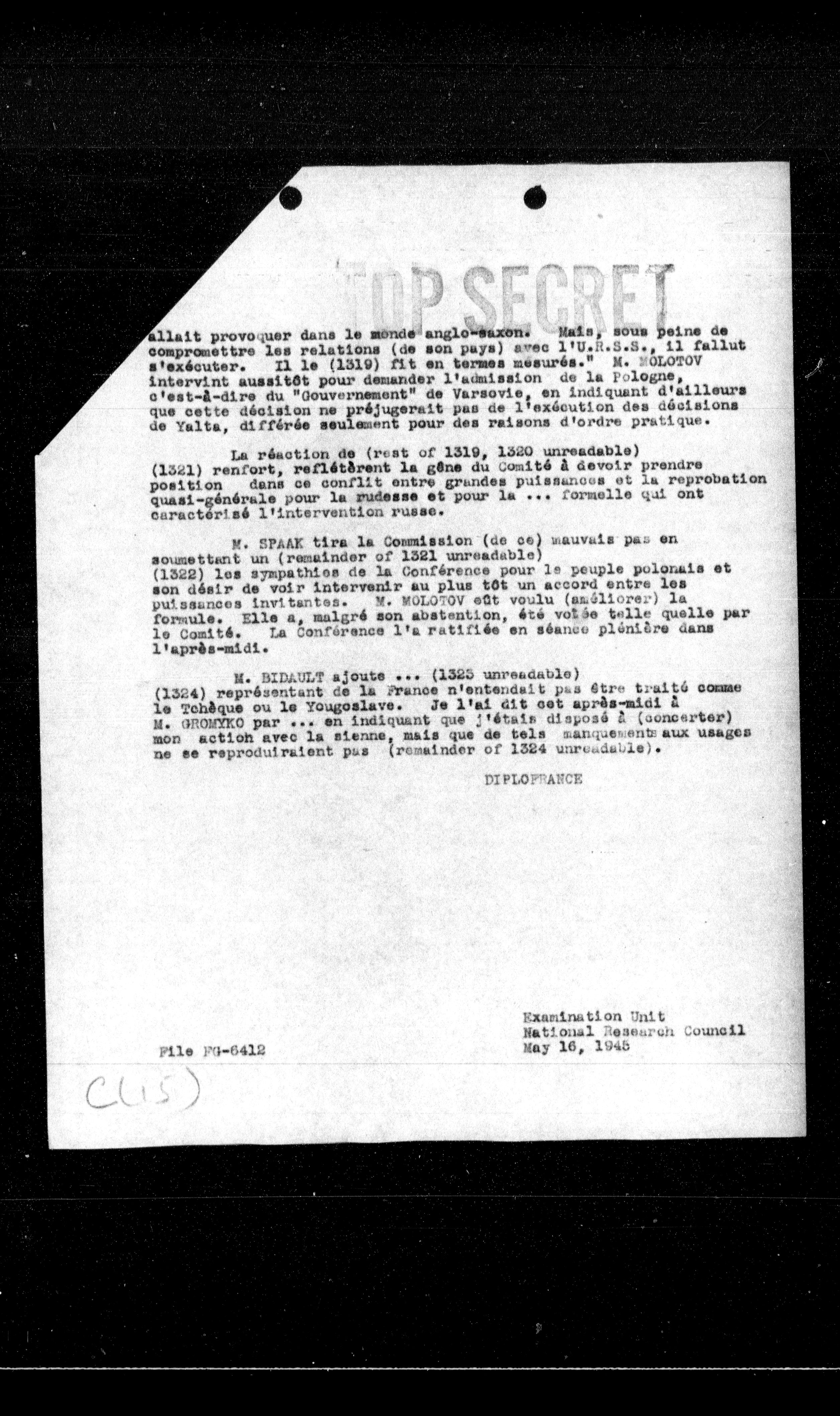 M. SPAAK tira la Commission (de ce) mauvals pas en soumettant un (remainder of 1321 unreadable) (1322) les sympathies de la conférence pour le peuple polonais et son désir de voir intervenir au plus tôt un accord entre les puissances invitantes. M. BOLOTOV eut voulu (amoliorer) la formule. Elle a, malgré son abstention, été volée telle quelle par le Comité. La conférence l'a ratifiée en séance plénière dans l'après-midi.